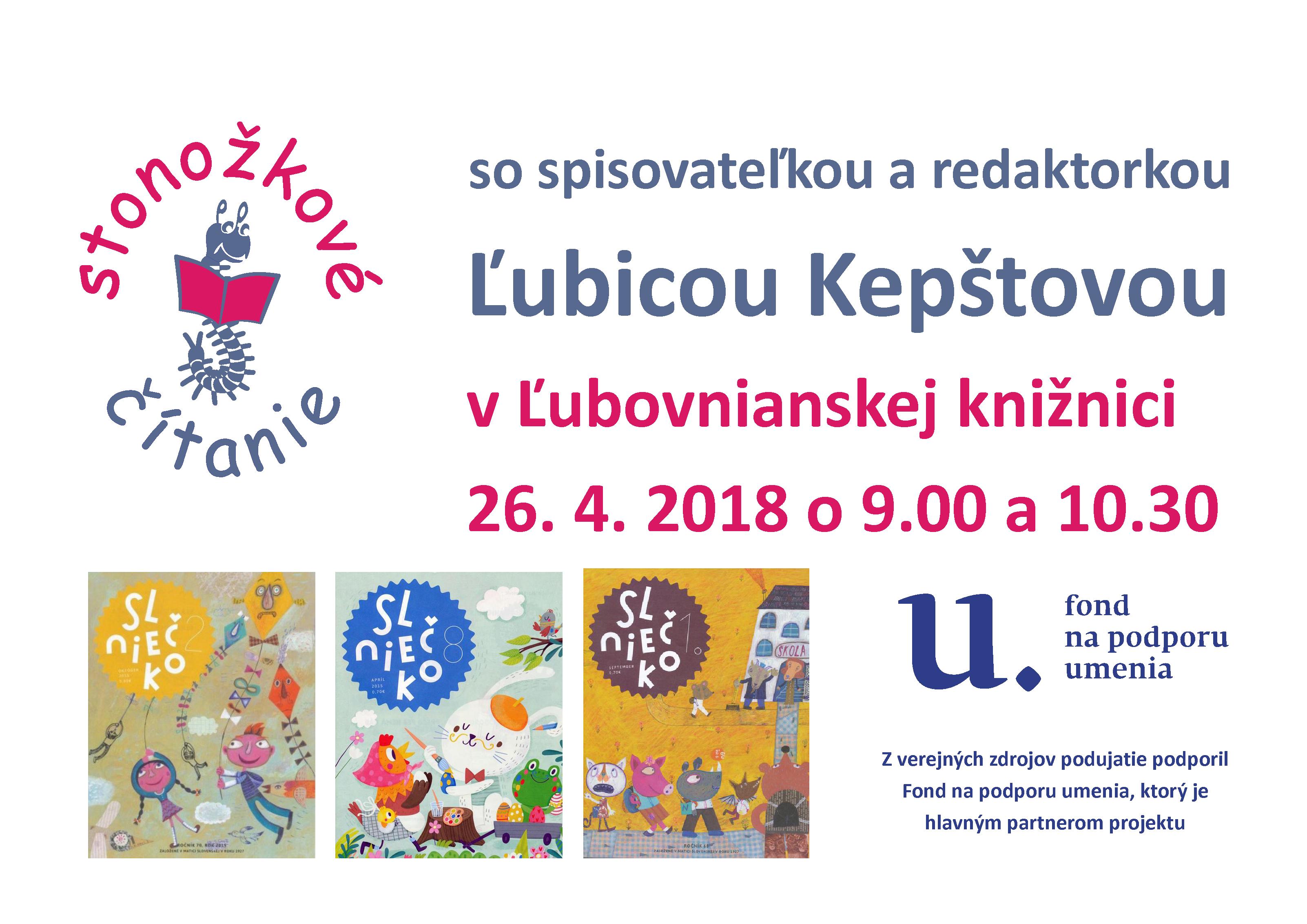 Stretnutie bude prebiehať v Ľubovnianskej knižnici formou besedy so spisovateľkou Ľubicou Kepštovou a žiakmi zo ZŠ v Starej Ľubovni zapojených do projektu Stonožkové čítanie.