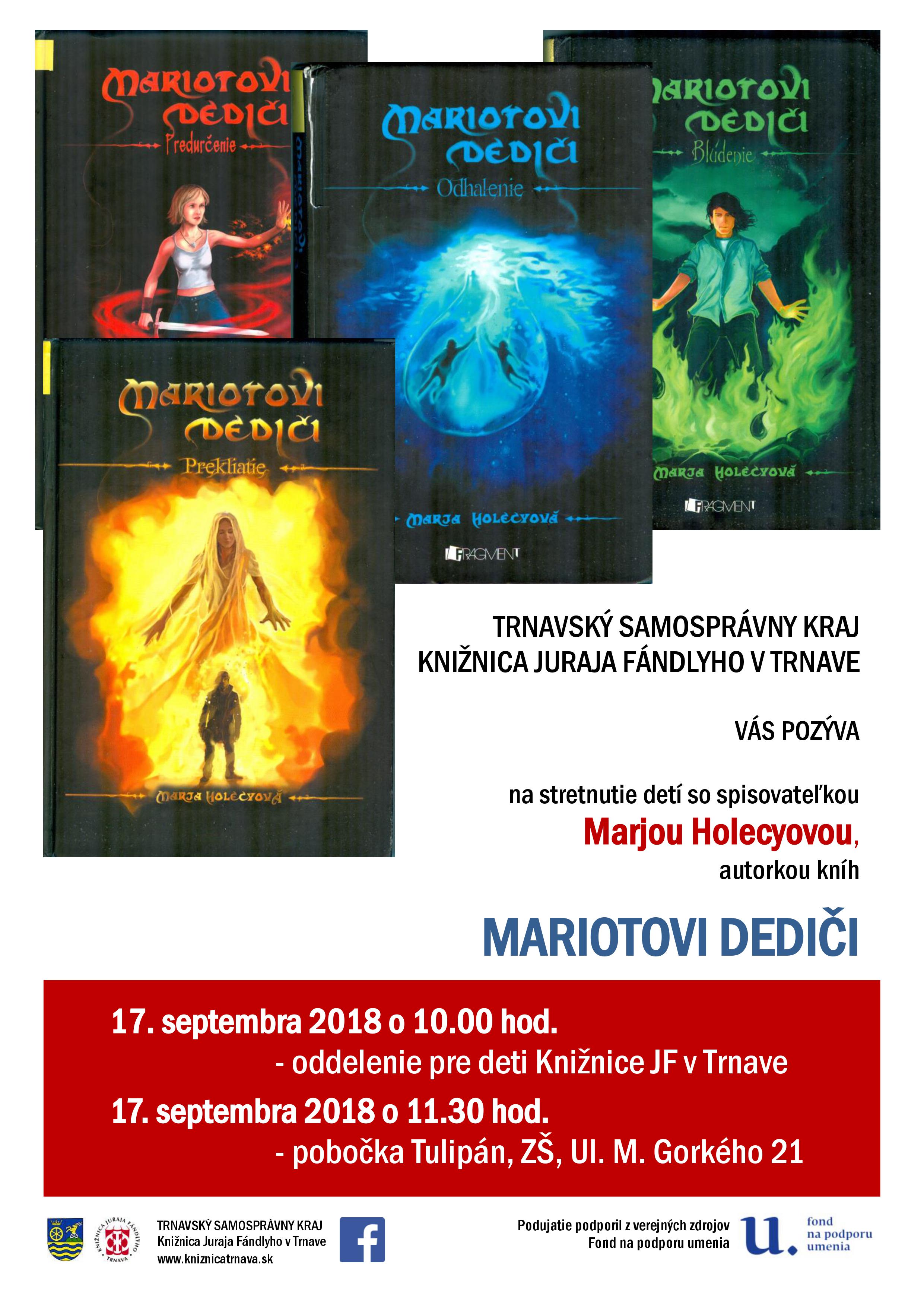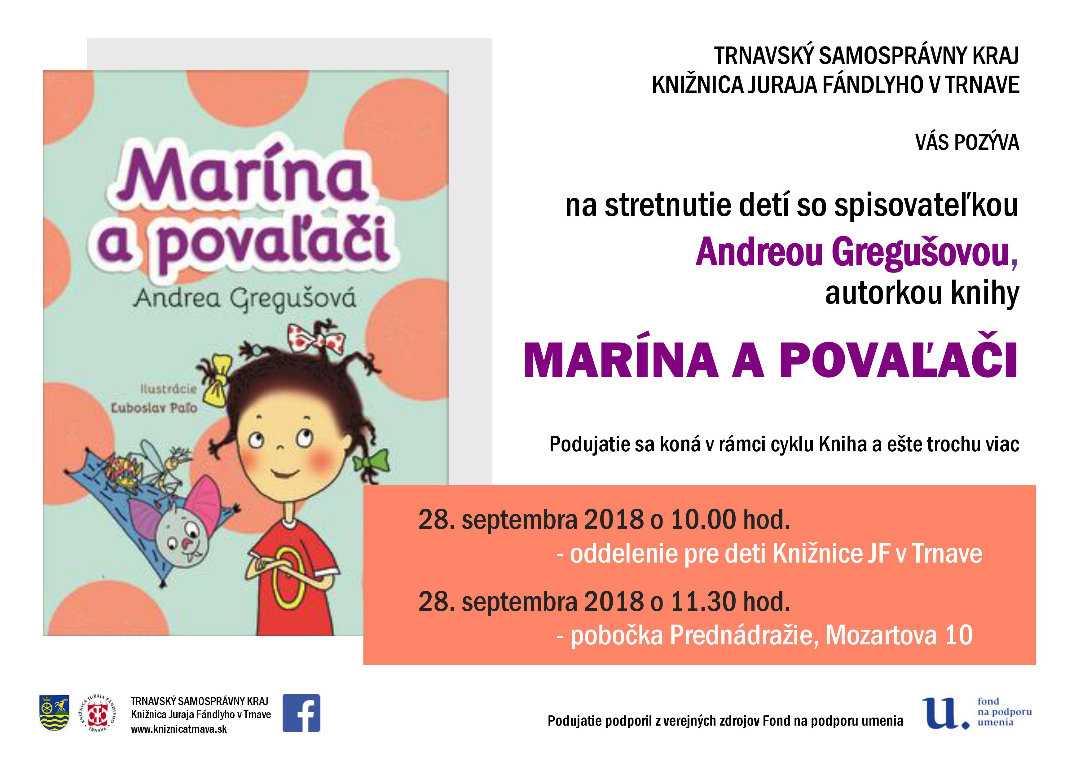 Stretnutie detí s Andreou Gregušovou, autorkou knihy Marína a povaľači. Prvé stretnutie sa koná 28. septembra 2018 o 10.00 hod v oddelení pre deti a druhé o 11.30 hod. v pobočke Prednádražie, Mozartova 10.