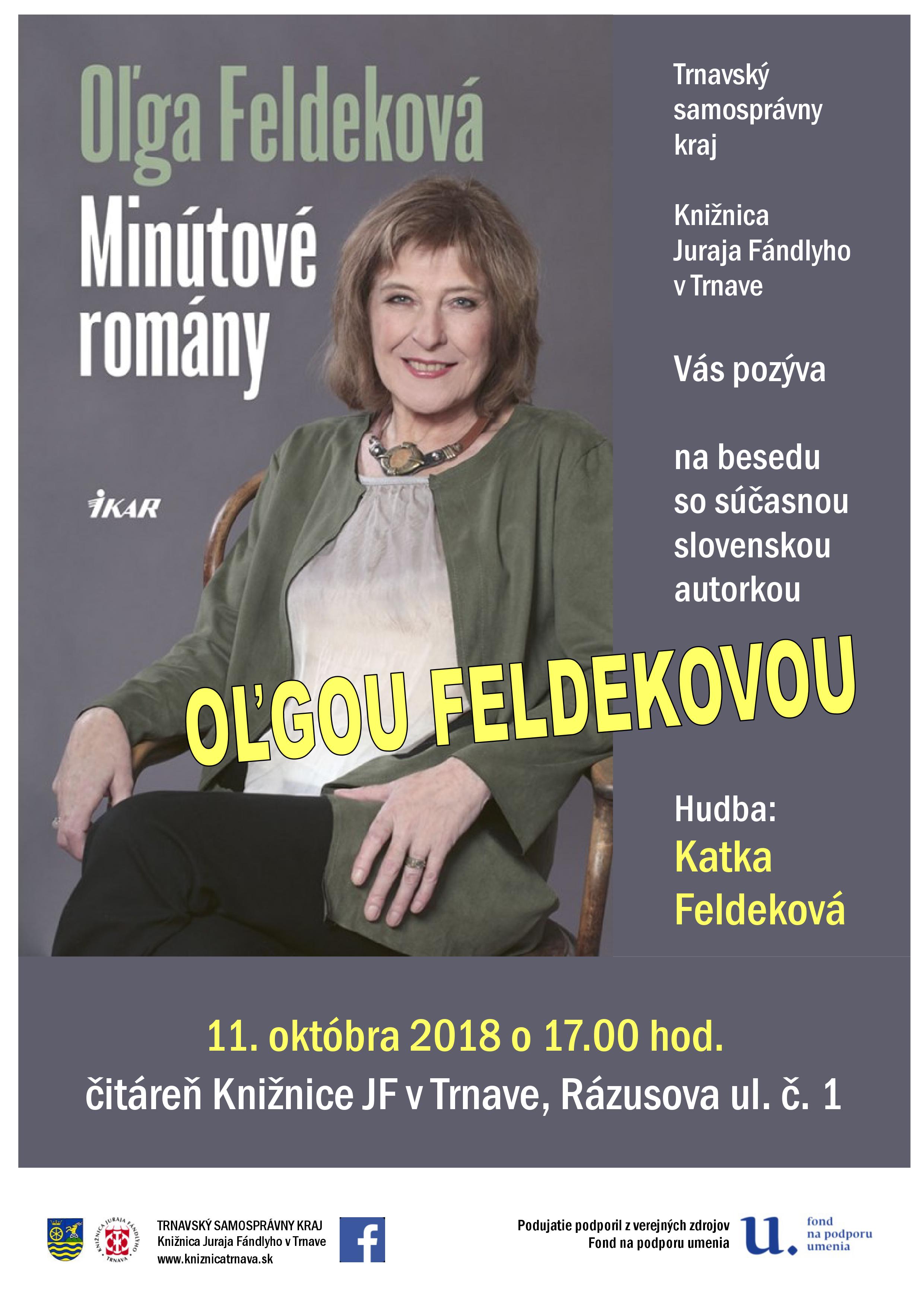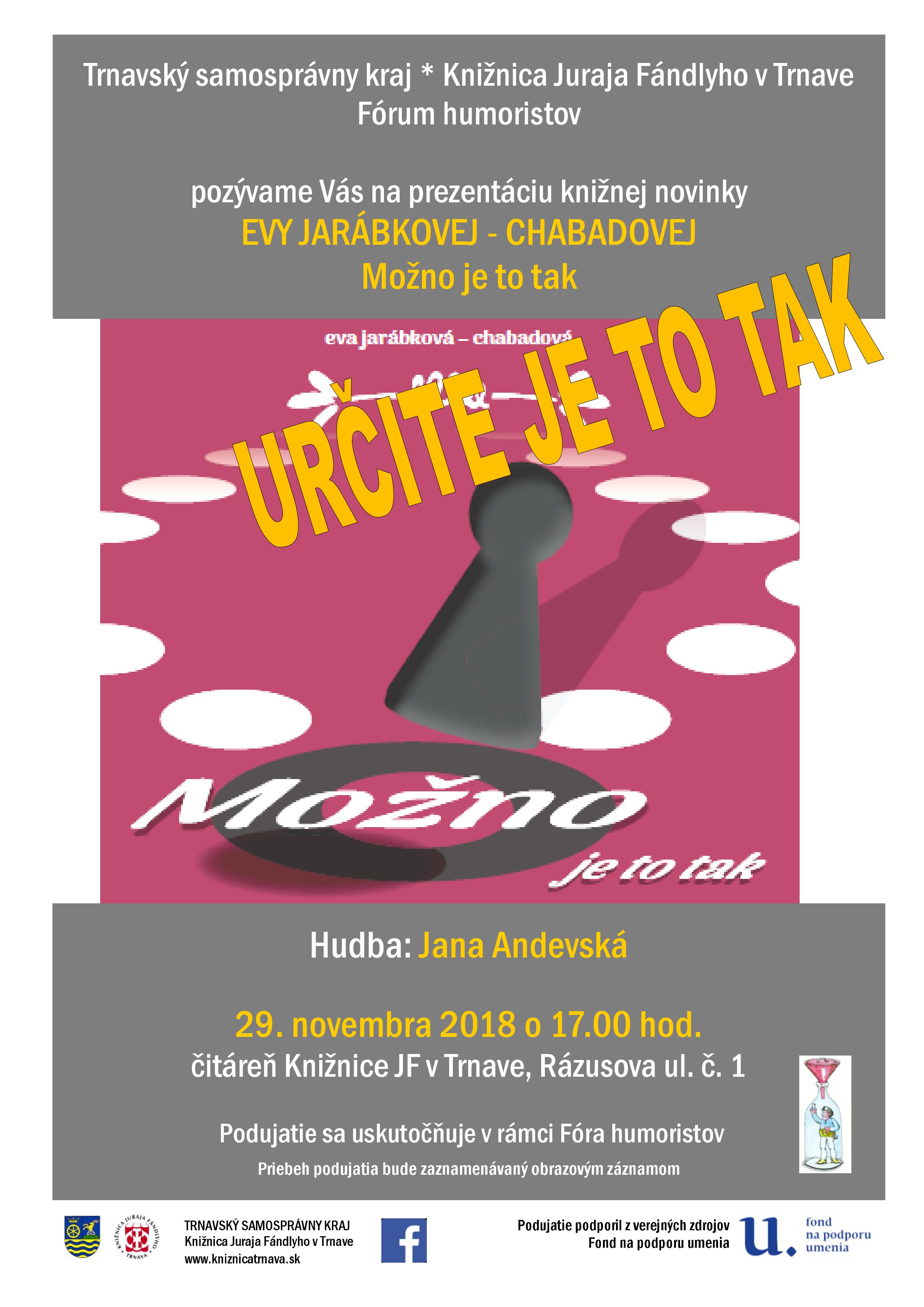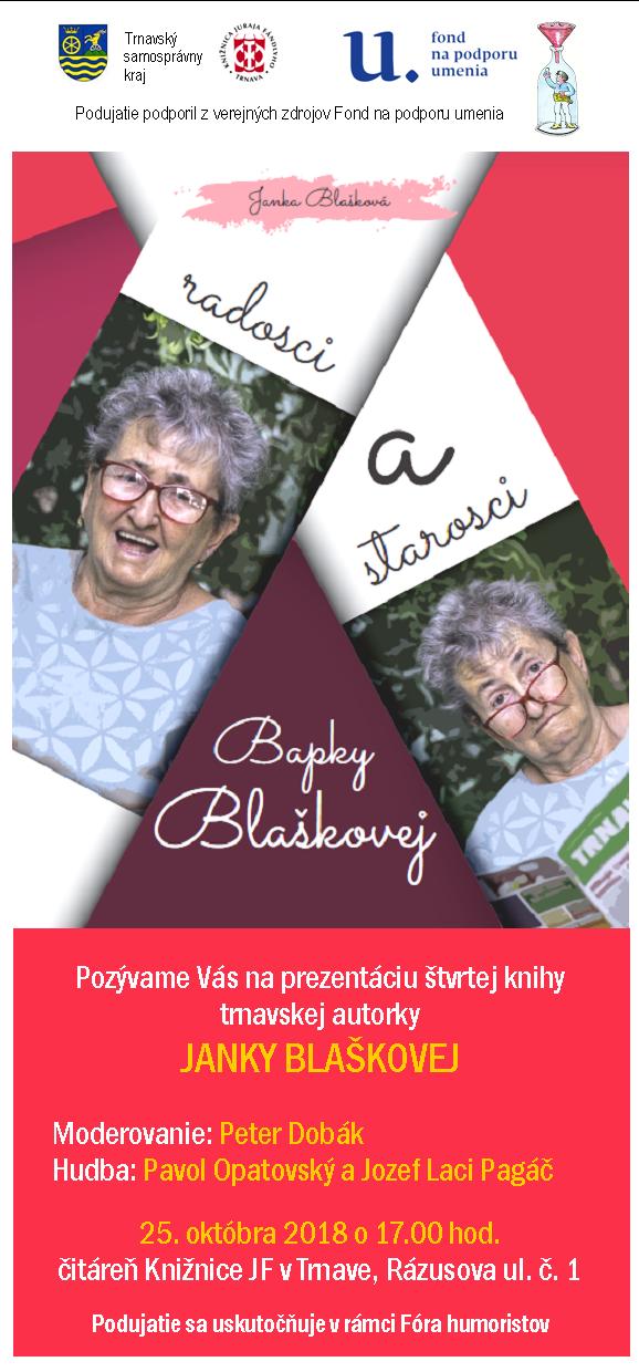 Pozývame Vás na prezentáciu štvrtej knihy trnavskej autorky Janky Blaškovej. Moderovanie: Peter Dobák, hudba: Pavol Opatovský a Jozef Laci Pagáč - 25. 10. 2018 o 17.00 hod. v čitárni Knižnice JF v Trnave