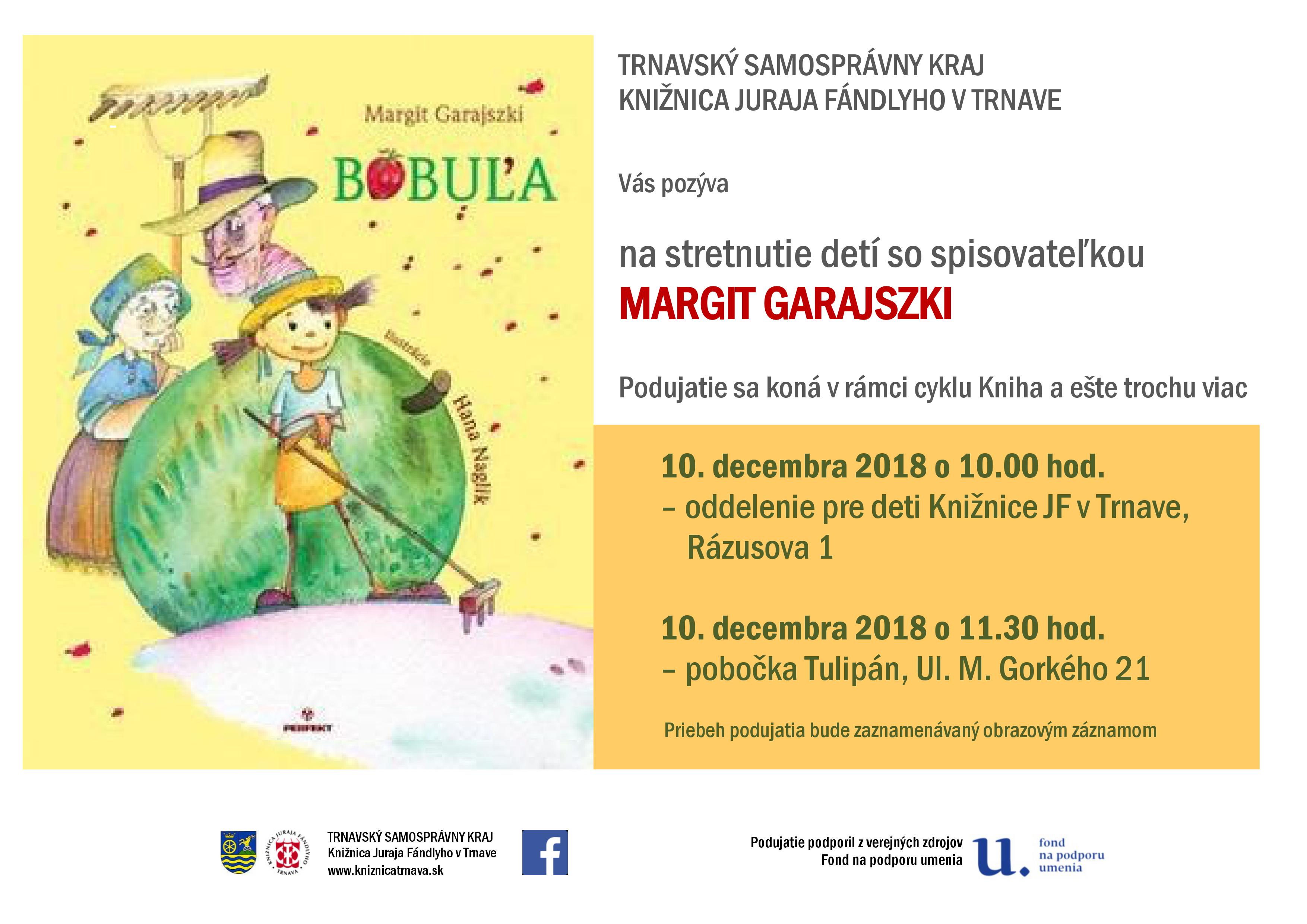 Stretnutie detí so spisovateľkou Margit Garajszki dňa 10. 12. 2018 o 10.00 hod. v oddelení pre deti a o 13.30 hod v pobočke Tulipán
