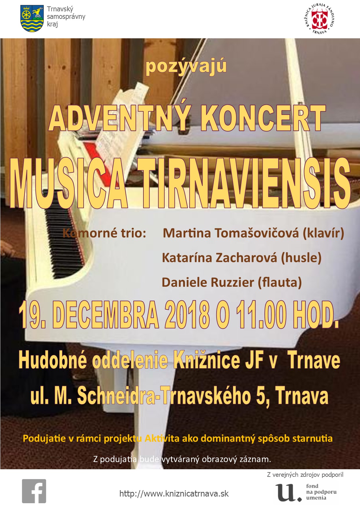 Adventný koncert komorného tria Musica Tirnaviensis v zložení Martina Tomašovičová (klavír), Katarína Zacharová (husle) a Daniele Ruzzier (flauta) sa koná 19. 12. 2018 v hudobnom oddelení Knižnice JF v Trnave o 11. 00 hod.