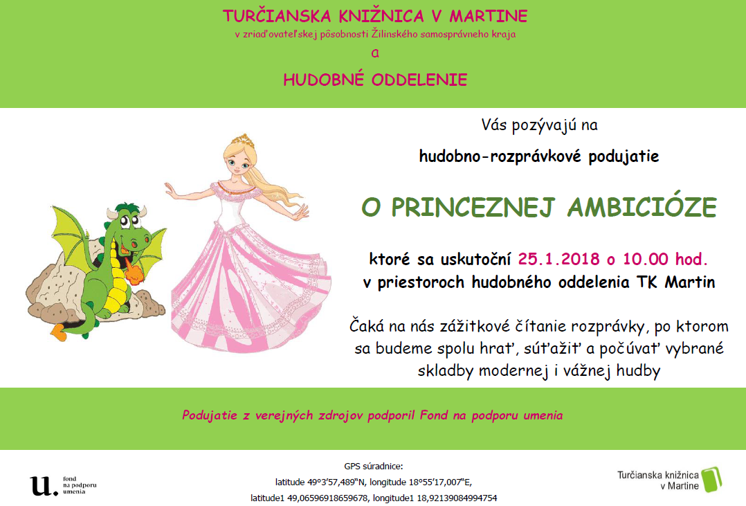 Hudobno-rozprávkové podujatie O princeznej Ambicióze sa s podporou Fondu na podporu umenia uskutoční 25.1.2018 o 10.00 v priestoroch hudobného oddelenia Turčianskej knižnice v Martine.