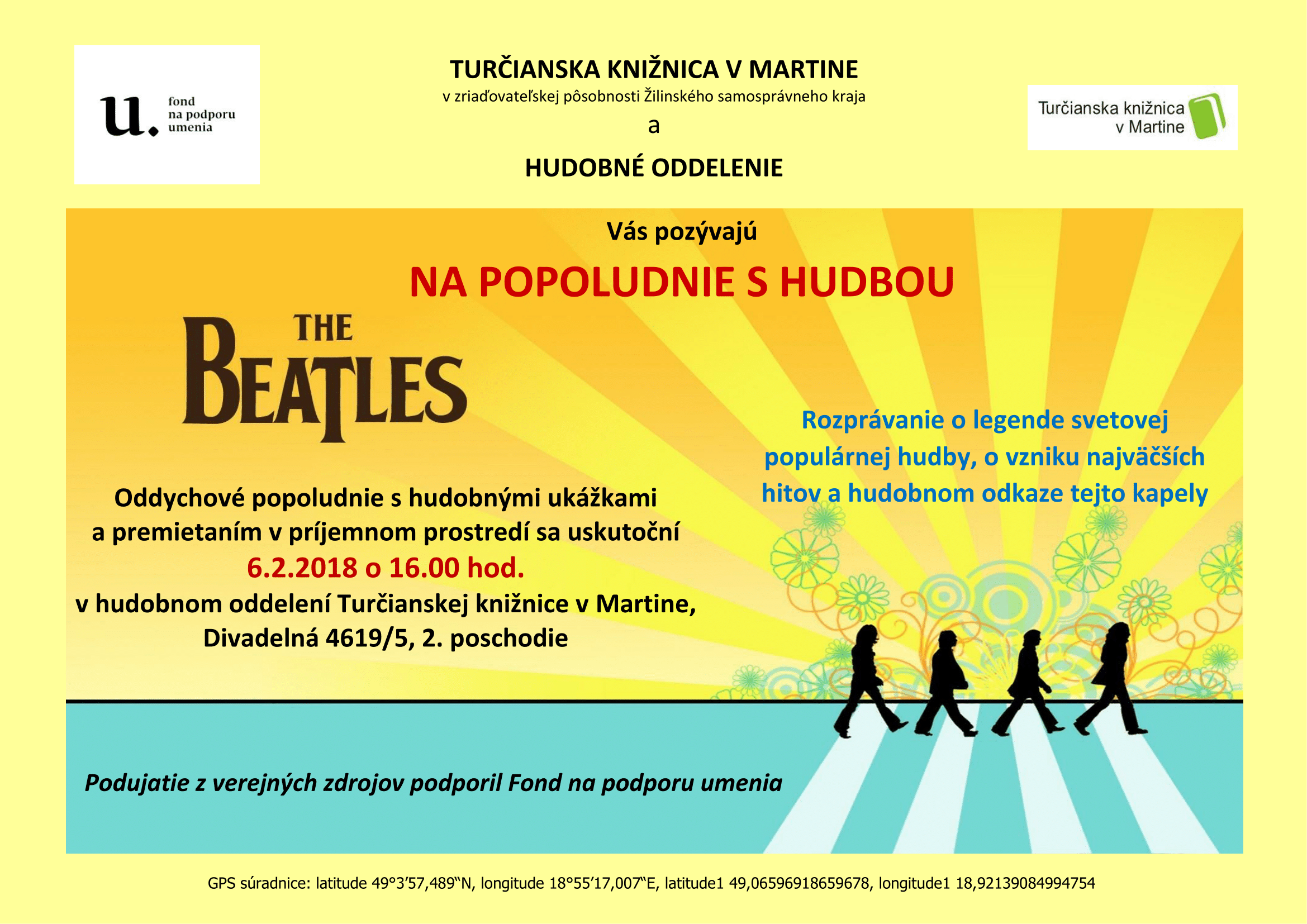 Hudobno-oddychové podujatie Beatles z cyklu Popoludnie s hudbou určené širokej verejnosti sa uskutoční 6.2.2018 o 16.00 v priestoroch hudobného oddelenia Turčianskej knižnice v Martine. Podujatie podporil z verejných zdrojov Fond na podporu umenia