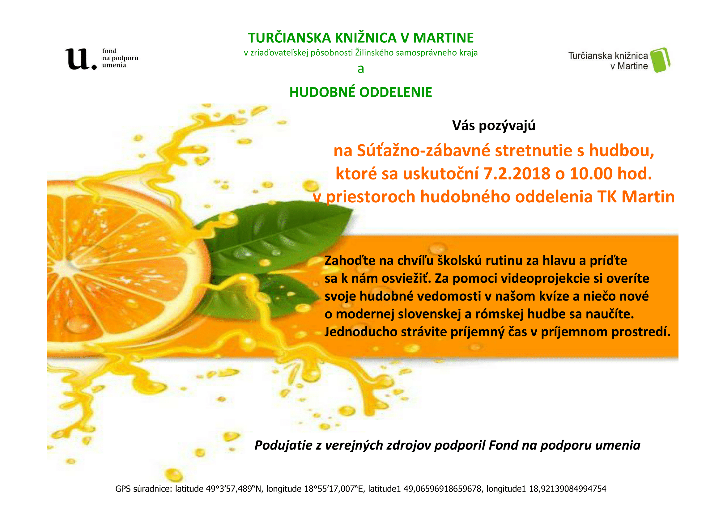 Súťažno-zábavné stretnutie s hudbou pre žiakov Špeciálnej základnej školy v Martine sa uskutoční 7.2.2018 o 10.00 v priestoroch hudobného oddelenia Turčianskej knižnice
