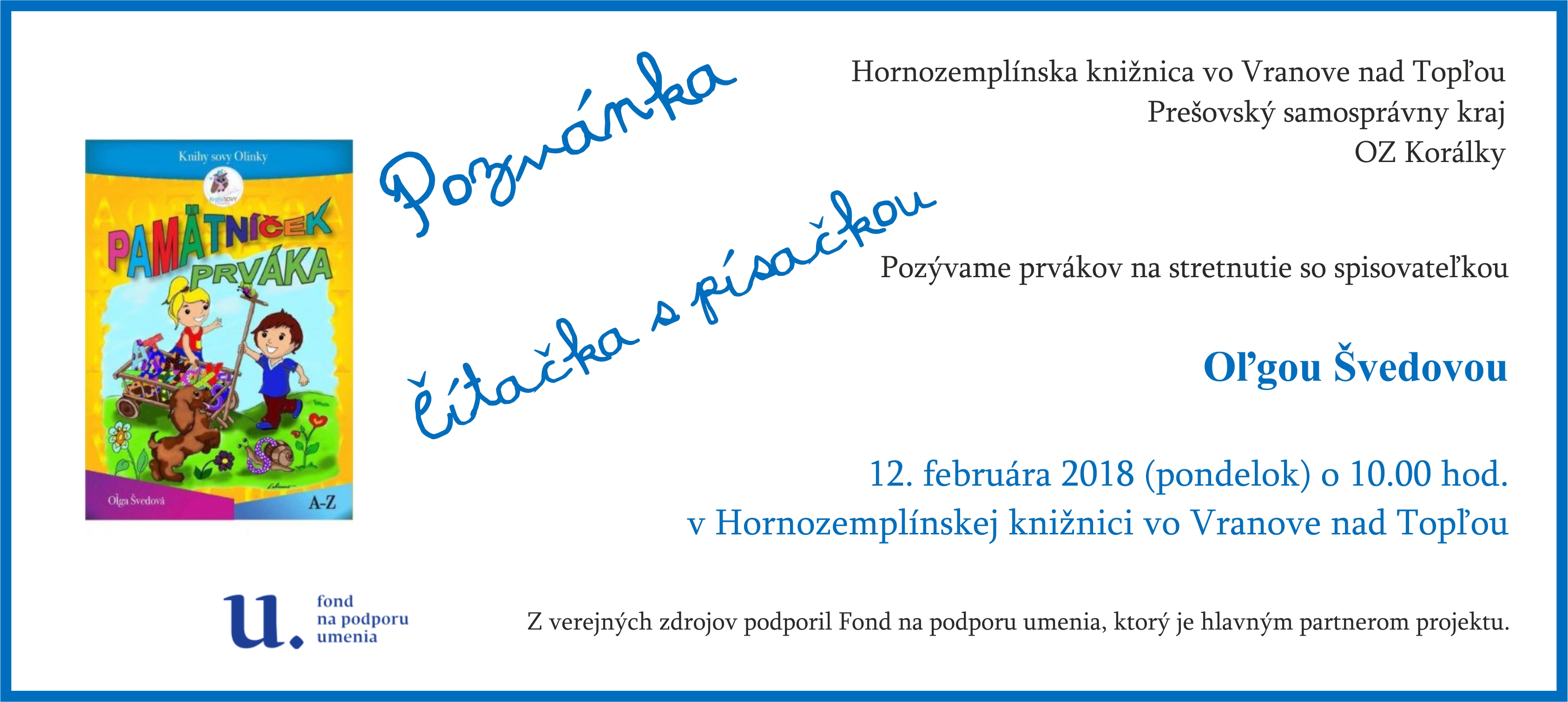 Stretnutie detských čitateľov so súčasnou slovenskou autorkou sa koná 16. 10. 2018 o 10.00 hod. v čitárni Knižnice JF v Trnave