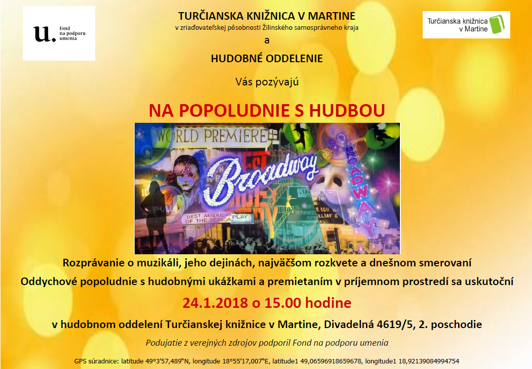 Hudobno-relaxačné podujatie Muzikály z cyklu Popoludnie s hudbou určené širokej verejnosti sa uskutoční 24.1.2018 o 15.00 v priestoroch hudobného oddelenia Turčianskej knižnice. Podujatie bolo z verejných zdrojov podporené Fondom na podporu umenia.
