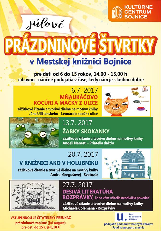 Počas štyroch júlových prázdninových štvrtkov pozývame deti na stretnutie s knihami Leonardo kocúr z ulice, Priatelia dažďa, Svetozár, Rozprávky.