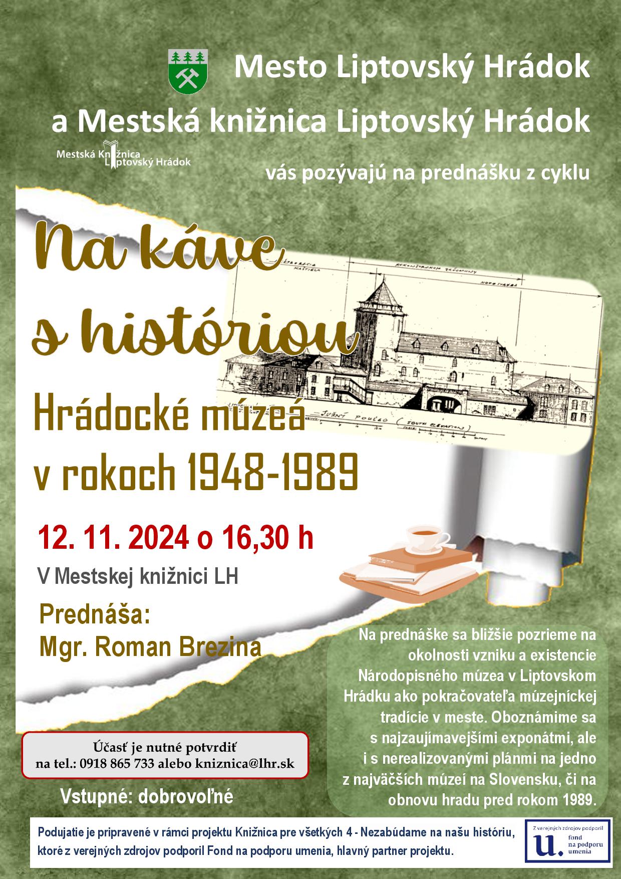 Pozývame vás 12. novembra o 16,30 h na pokračovanie cyklu prednášok Na káve s históriou - Nezabúdame na našu históriu. Tento raz príde o histórii prednášať Mgr. Roman Brezina.