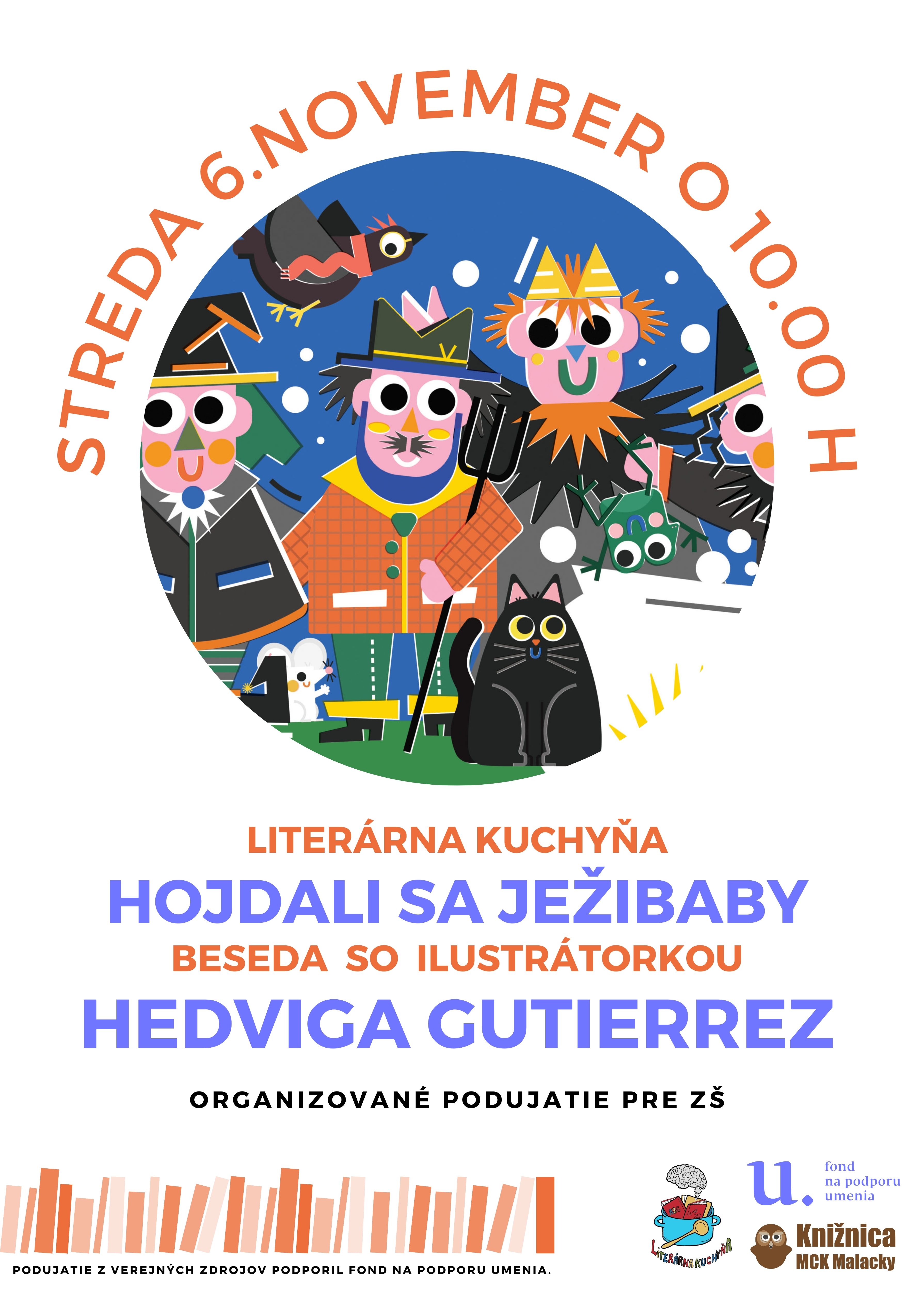 Knižnica MCK Malacky v Literárnej kuchyni namieša štvrtú jesennú výchovno-vzdelávaciu kašu, ktorá podporuje čitateľskú gramotnosť, čiže trávenie kníh u detí a mládeže a ich záujem o literatúru.Do našej kuchyne príde známa slovenská ilustrátorka Hedviga Gutierrez, a predstaví svoje najúspešnejšie knihy medzi deťmi S knihou Hojdali sa ježibaby od záhoráckeho spisovateľa Jožka Jakubovca Moravčíka si v tvorivej dielni s ilustrátorkou Hedvigou Gutierrez vyrobíme prekvapenie.