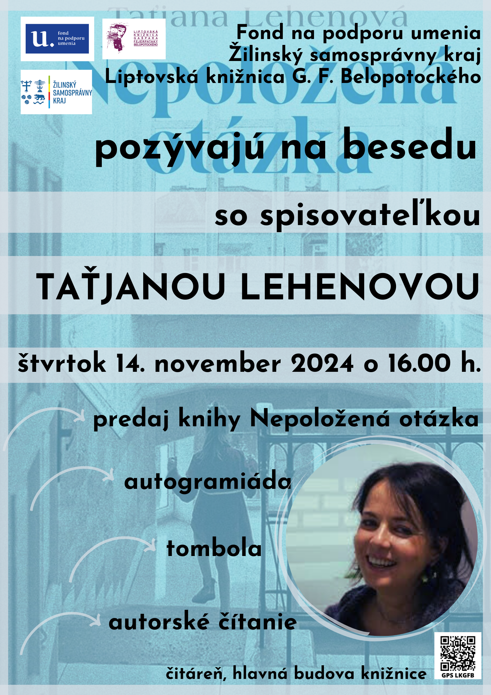 Autorská beseda so spisovateľkou Taťjanou Lehenovou; 14. november 2024 o 16.00 hod. v multimediálnom úseku knižnice