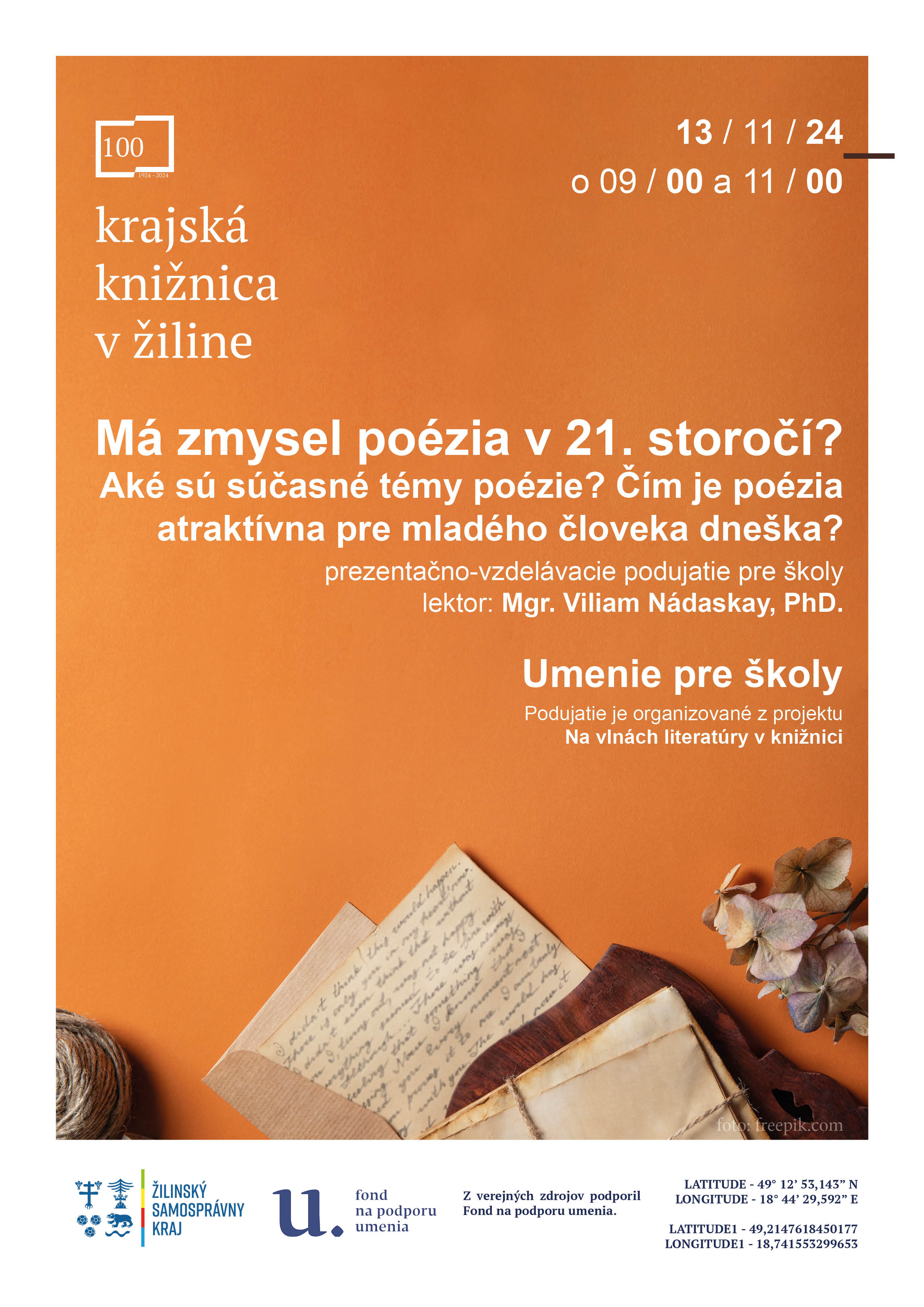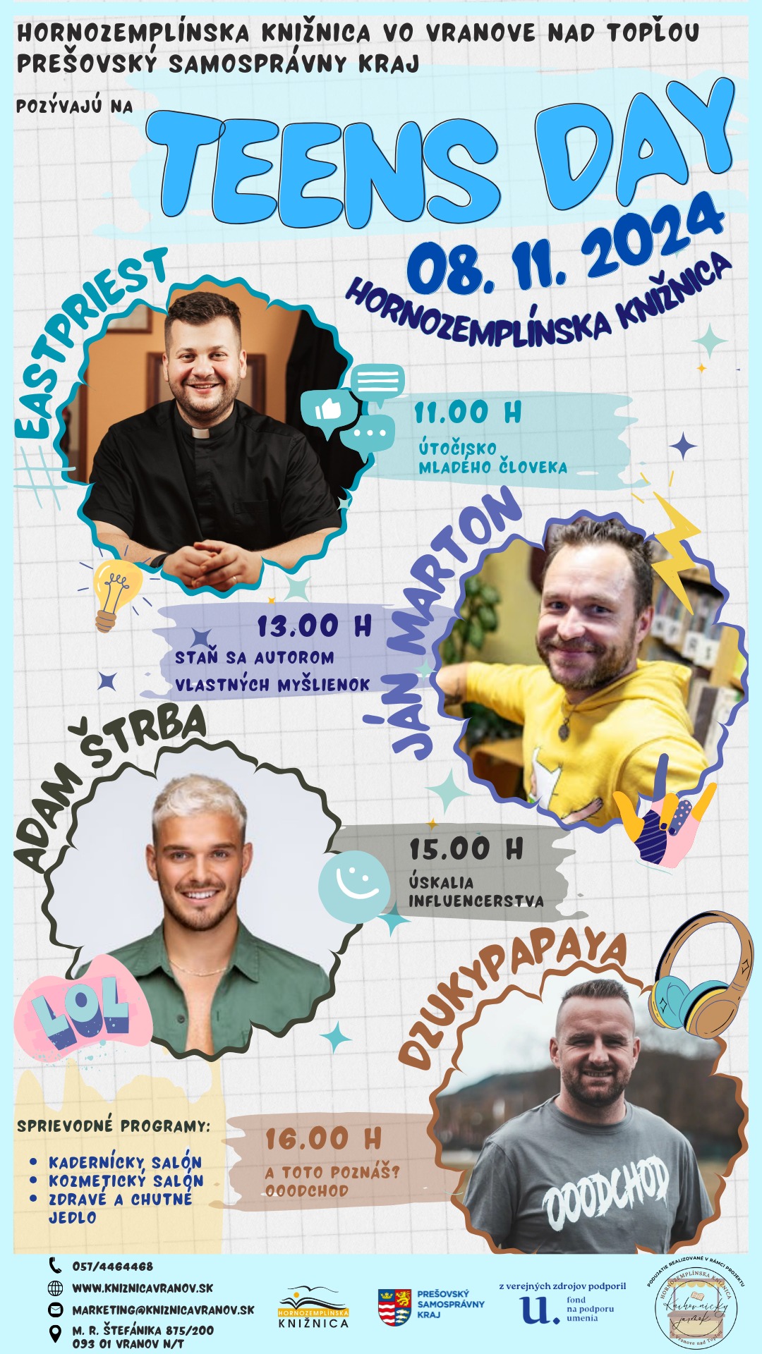 Hornozemplínska knižnica vo Vranove nad Topľou a Prešovský samosprávny kraj Vás pozývajú na podujatie Teens day, ktoré je venované všetkým študentom pri príležitosti Dňa boja za slobodu a demokraciu. Cieľom podujatia je osloviť mladých ľudí, ktorých chceme inšpirovať, naučiť, podporiť čítanie a predstaviť im osobnosti z rôznych oblastí spoločenského života. Tešíme sa na vás 8.11.2024. Podujatie podporil Fond na podporu umenia, ktorý je hlavným partnerom projektu Knihovnícky jarmok.