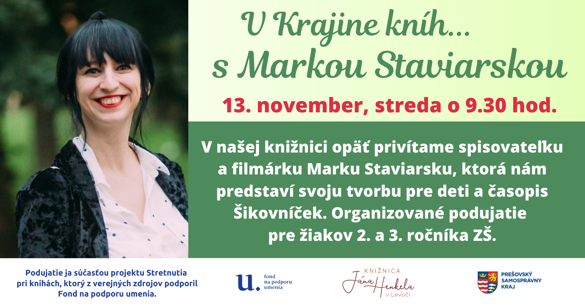 V rámci cyklu besied v Krajine kníh nás v novembri opäť navštívi spisovateľka Marka Staviarska, ktorá deťom porozpráva o svojich knihách pre deti a predstaví nám aj detský časopis Šikovníček.