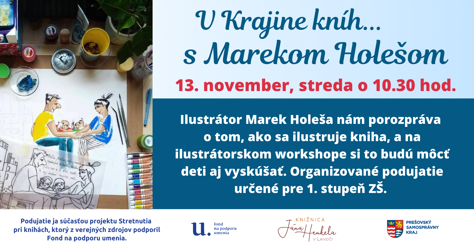 V rámci cyklu besied V krajine kníh sme si v novembri pozvali do knižnice výtvarníka a ilustrátora Mareka Holešu, ktorý deťom porozpráva o práci ilustrátora a pripravil pre nich aj malý workshop.