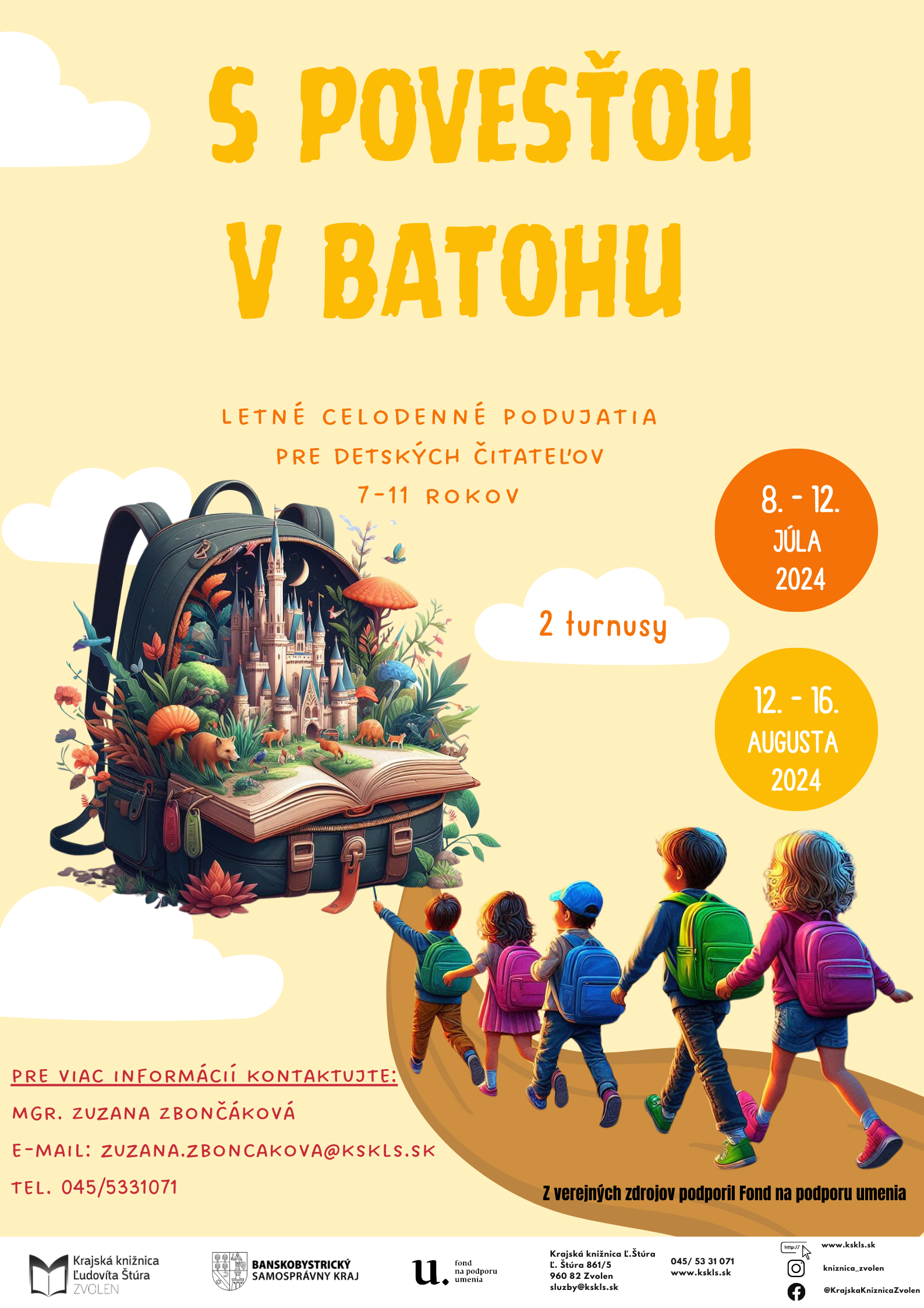 Dva letné turnusy celodenných výchovno-vzdelávacích aktivít pre prázdninujúce deti pod názvom S povesťou v batohu, ktorý je zároveň aj tematickým zameraním celých aktivít v rámci programu.