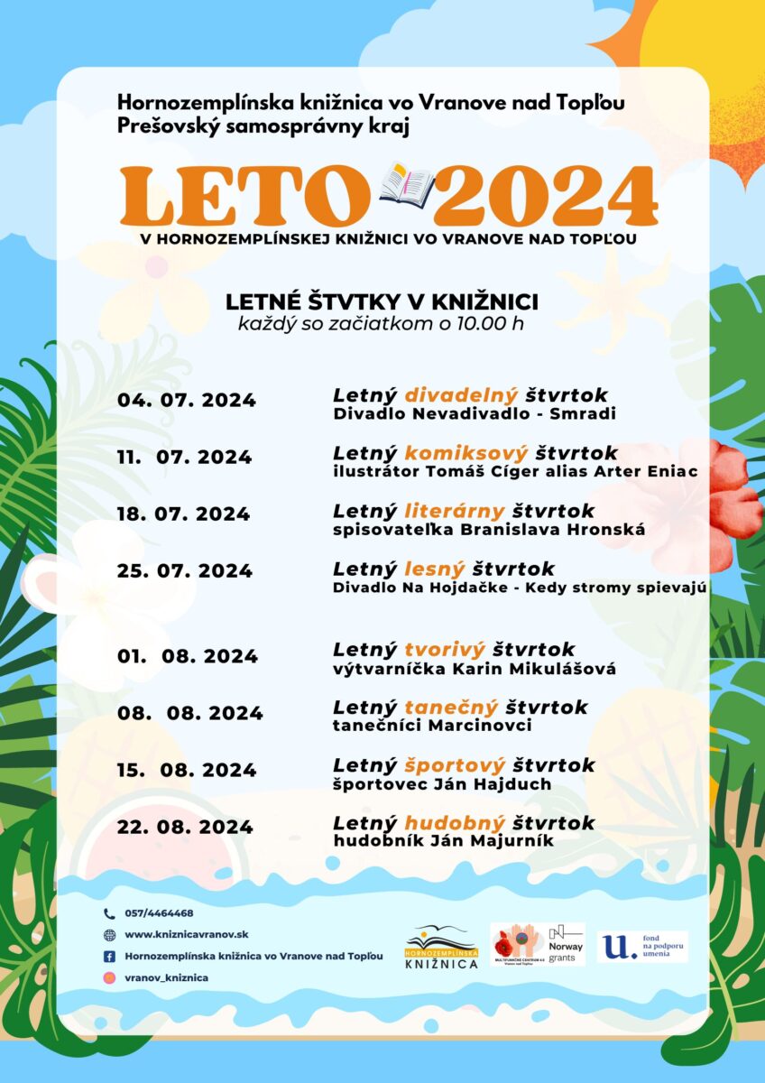 Hornozemplínska knižnica vo Vranove nad Topľou a Prešovský samosprávny kraj pozývajú na LETNÉ ŠTVRTKY do knižnice. Júl a august sú už tradične spojené s obľúbenými Letným štvrtkami v knižnici, ktoré sa budú konať každý štvrtok o 10.00 h v Hornozemplínskej knižnici vo Vranove nad Topľou. Čitatelia sa môžu tešiť na cyklus 8. letných štvrtkov plných rôznych tvorivých činností, dielní, hostí a kníh.