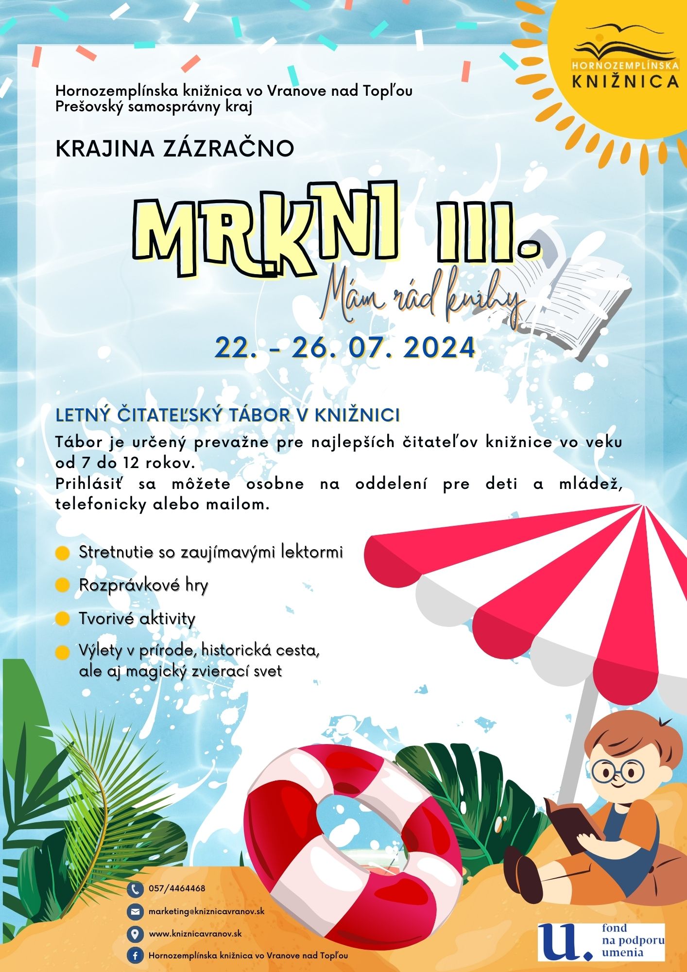 Hornozemplínska knižnica vo Vranove nad Topľou, Prešovský samosprávny kraj pripravujú počas letných prázdnin množstvo zaujímavých podujatí pre prázdninujúce deti. Pre všetkých táborníkov sme pripravili bohatý program pod vedením skúsených lektorov. Aktivity budú zamerané na podporu čítania, rozvoj fantázie a kreatívnych zručností. V detskom letnom tábore: Letný čitateľský tábor v knižnici s názvom MRKni. III. zašijú knižnú bombu. Termín realizácie tábora: 22. – 26. júl 2024.