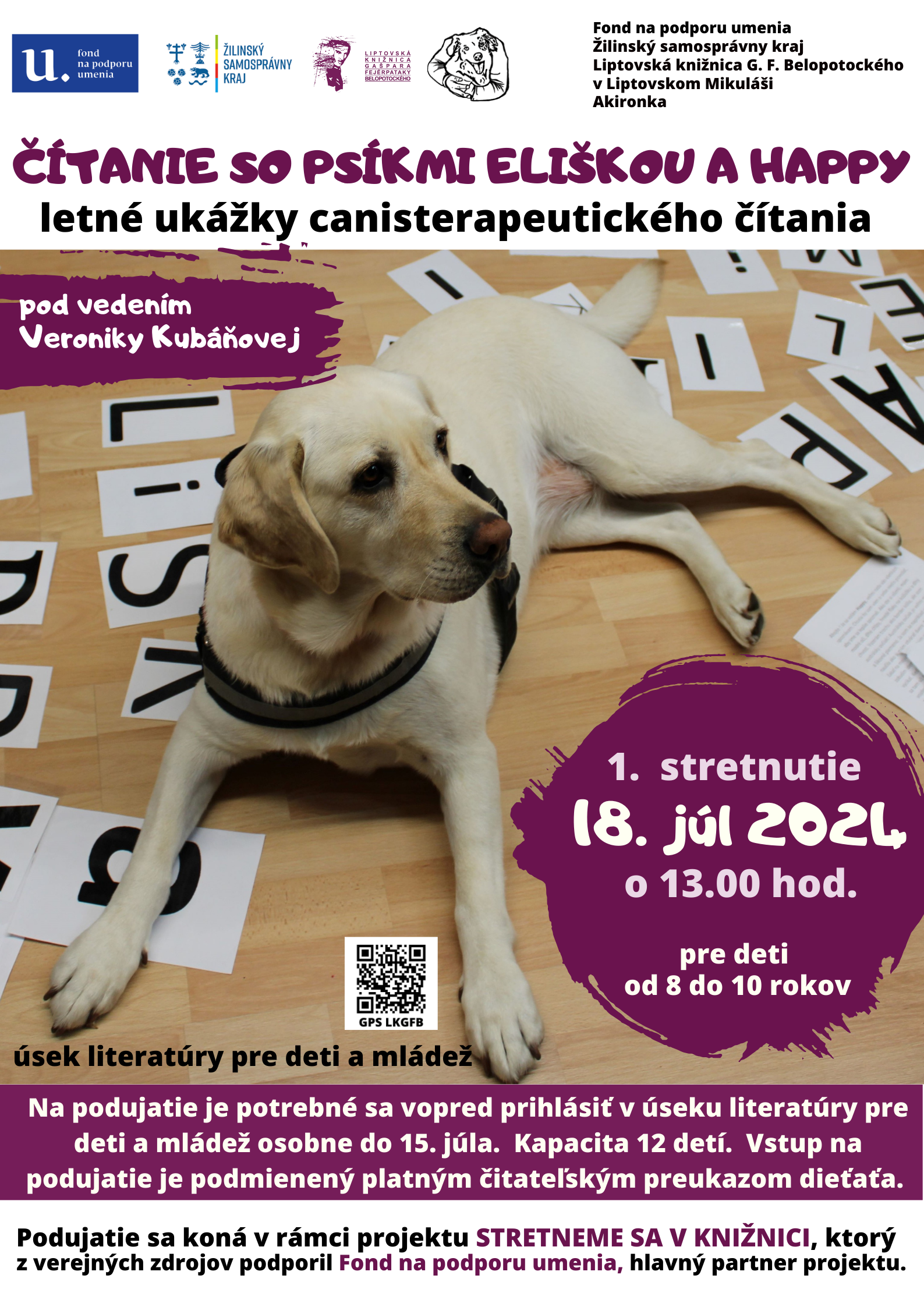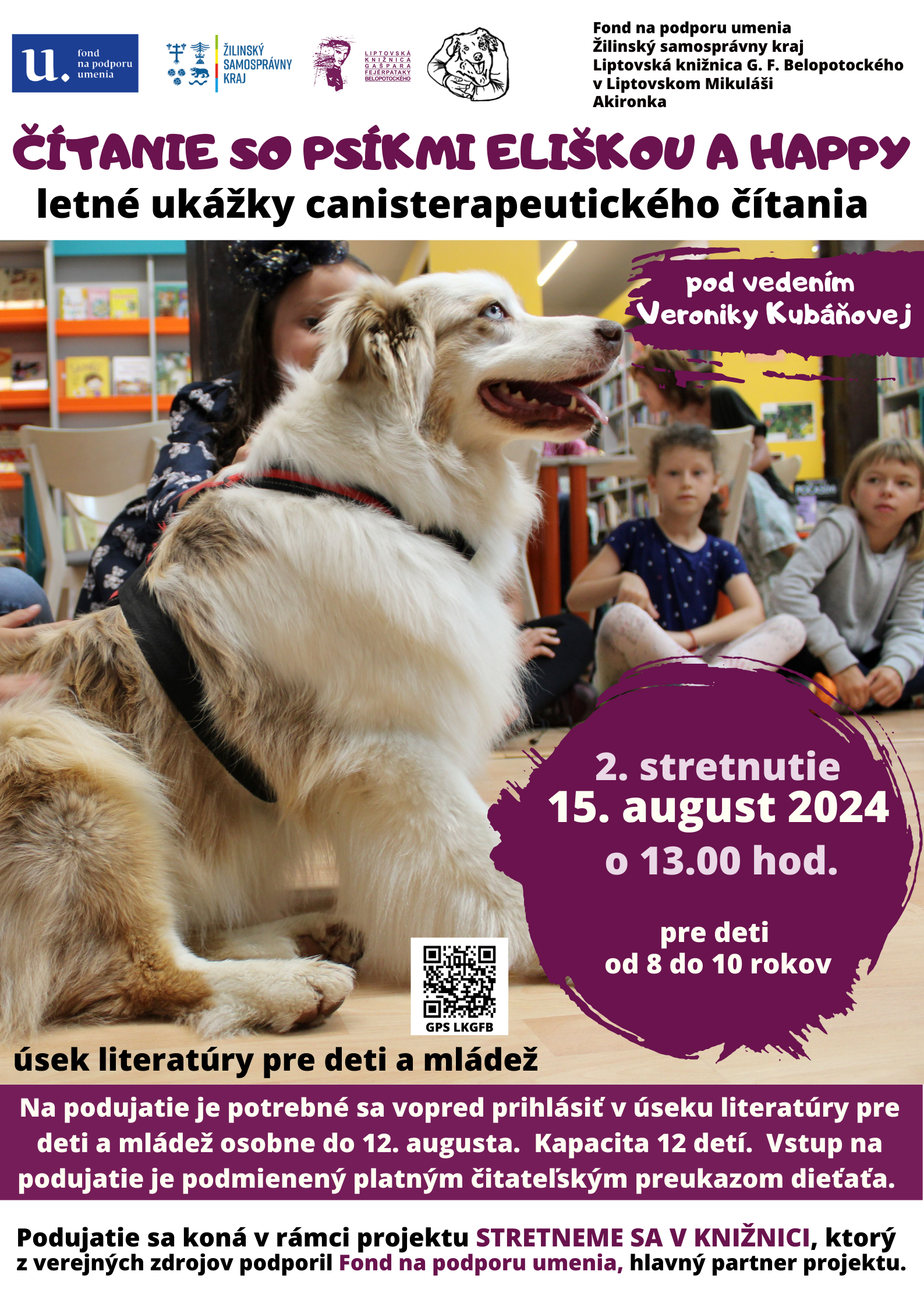 Čítanie so psíkmi Eliškou a Happy z tímu Akironka – ukážky canisterapie; 2. stretnutie: 15. august 2024 o 13.00 hod. v úseku literatúry pre deti a mládež