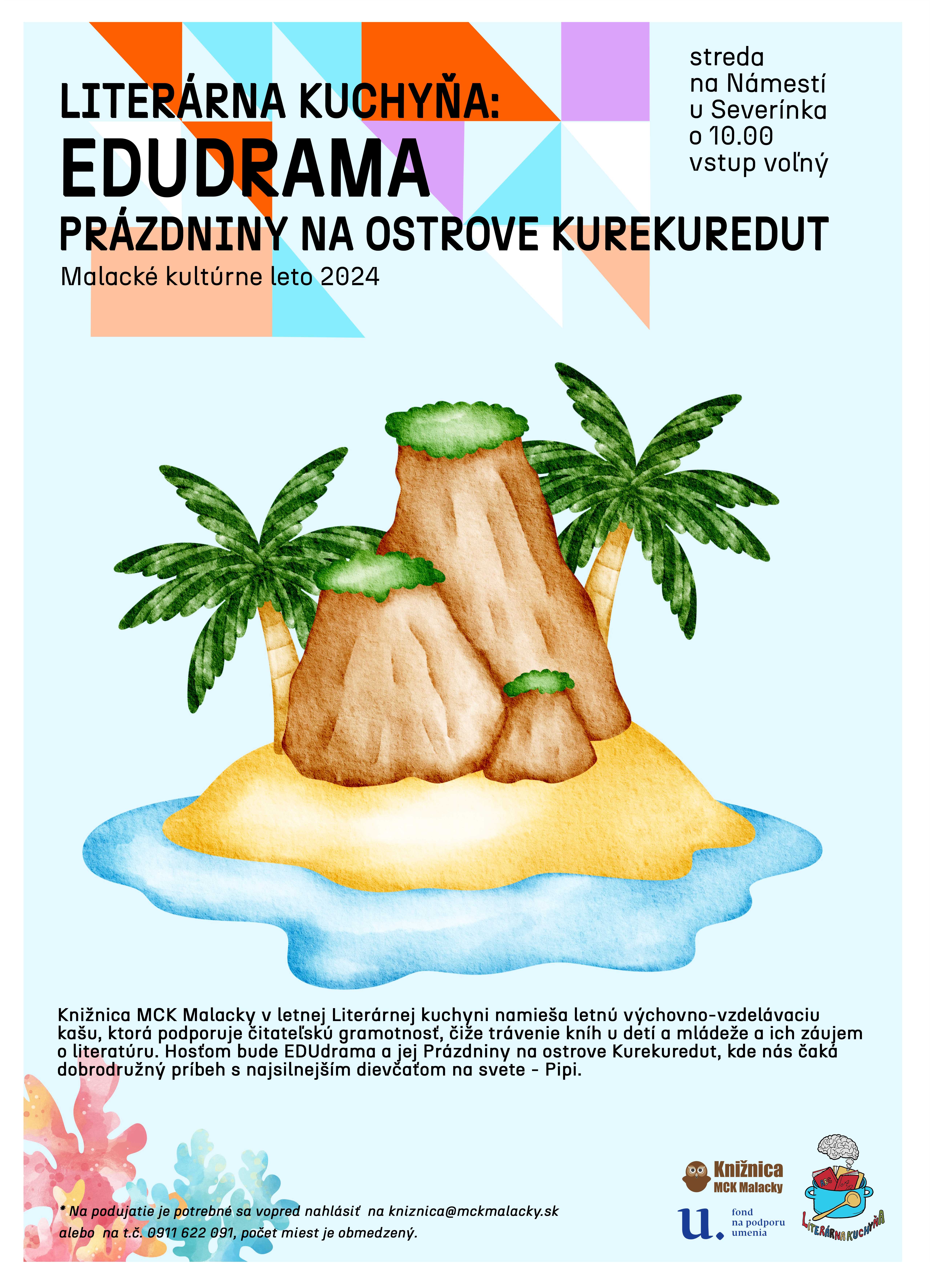 Knižnica MCK Malacky v letnej Literárnej kuchyni namieša letnú výchovno-vzdelávaciu kašu, ktorá podporuje čitateľskú gramotnosť, čiže trávenie kníh u detí a mládeže a ich záujem o literatúru. Hosťom bude EDUdrama a jej Prázdniny na ostrove Kurekuredut, kde nás čaká dobrodružný príbeh s najsilnejším dievčaťom na svete - Pipi.