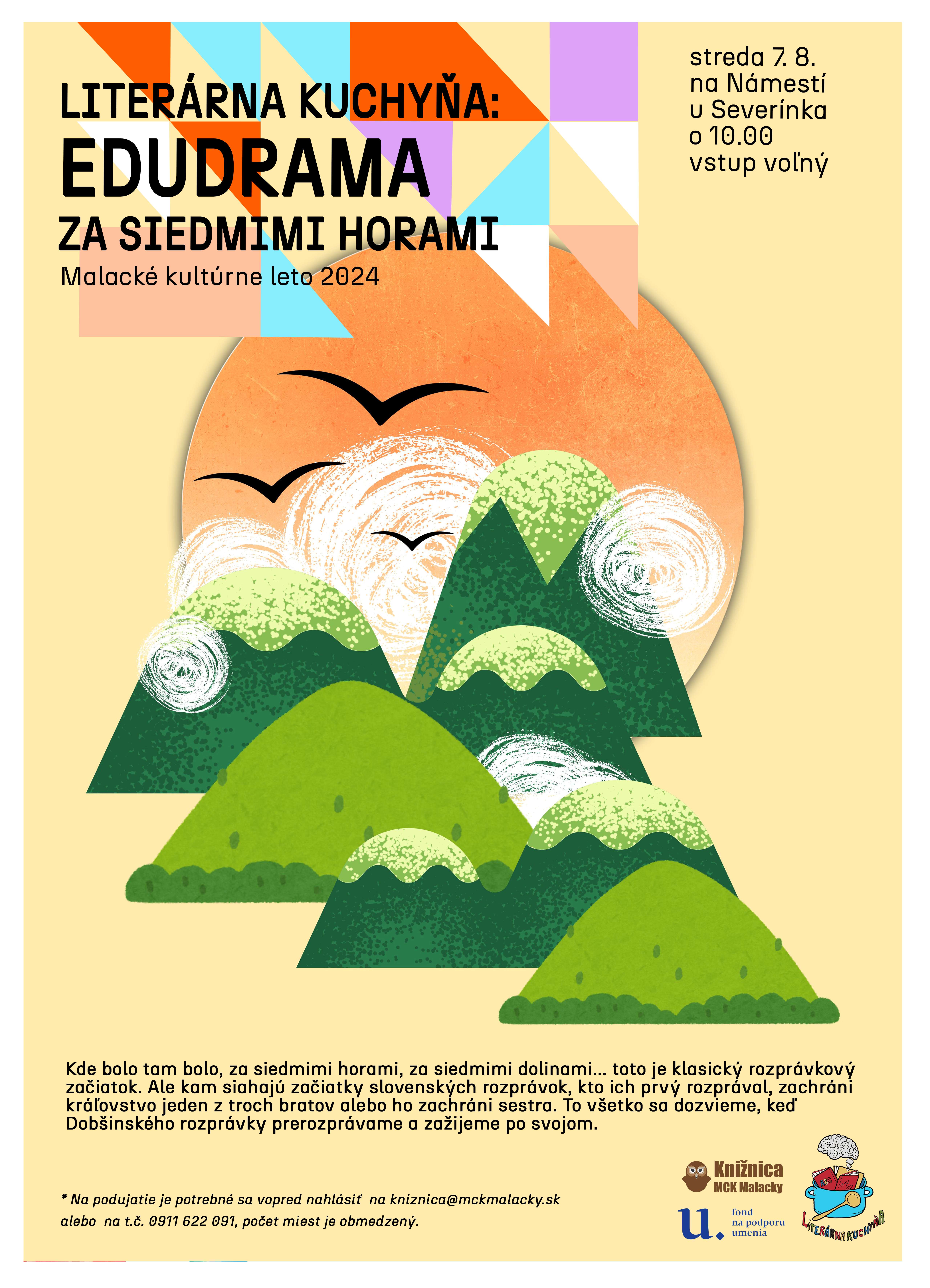 Knižnica MCK Malacky v letnej Literárnej kuchyni namieša letnú výchovno-vzdelávaciu kašu, ktorá podporuje čitateľskú gramotnosť, čiže trávenie kníh u detí a mládeže a ich záujem o literatúru. Srdečne vás pozývame na dramatizované predstavenie rozprávky Za siedmimi horami, ktorého sa vďaka skvelým herečkám stanete súčasťou. Edudrama ponúka program, v ktorom sa deti zoznámia s ľudovými rozprávkami, ich najznámejšími zberateľmi, ľudovou kultúrou, zvykmi a tradíciami.