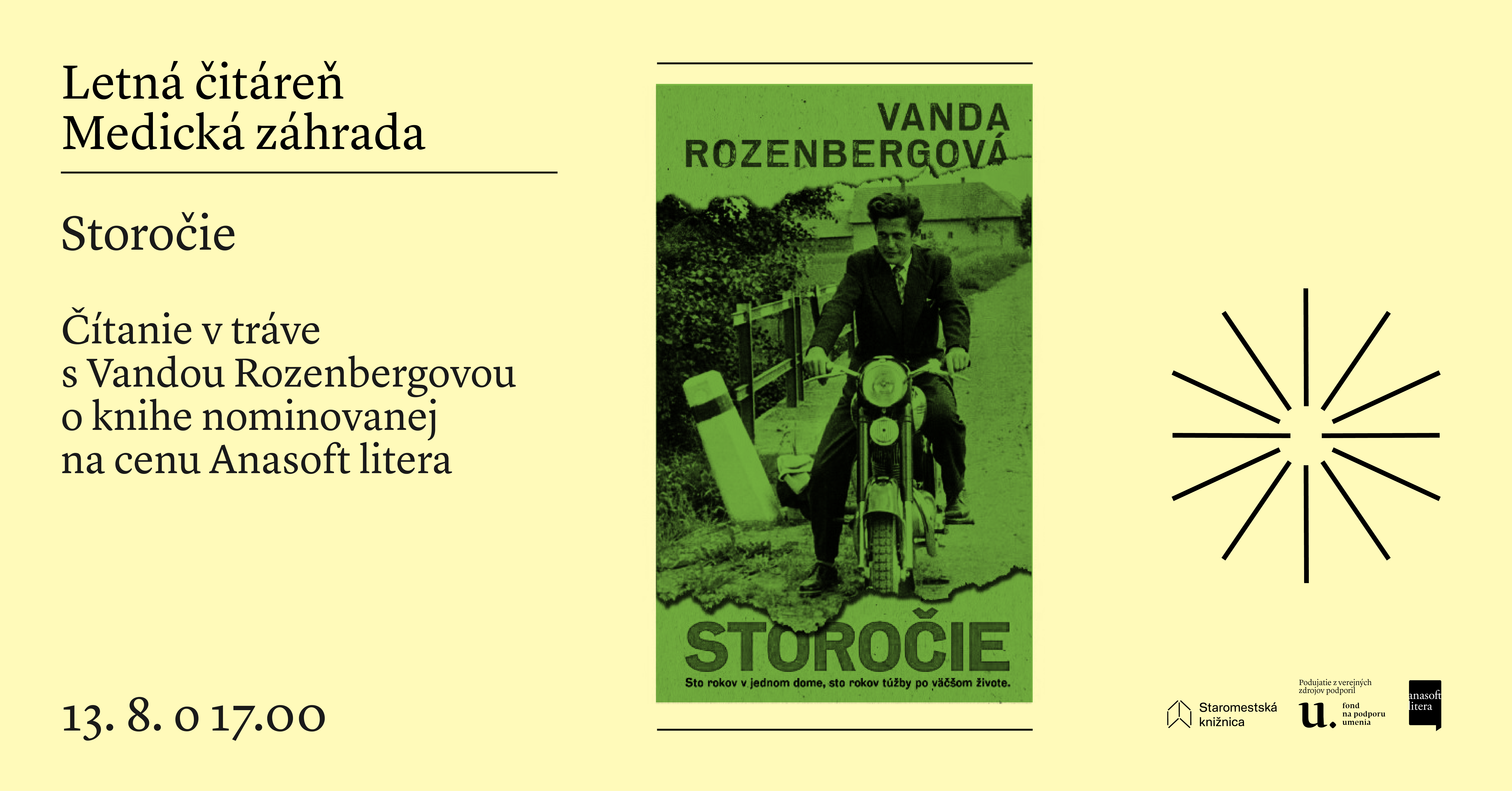 Čítanie v tráve s Vandou Rozenbergovou o knihe nominovanej na ocenenie Anasoft litera. Moderuje Simona Prokopec. V spolupráci s ars_litera o. z.
