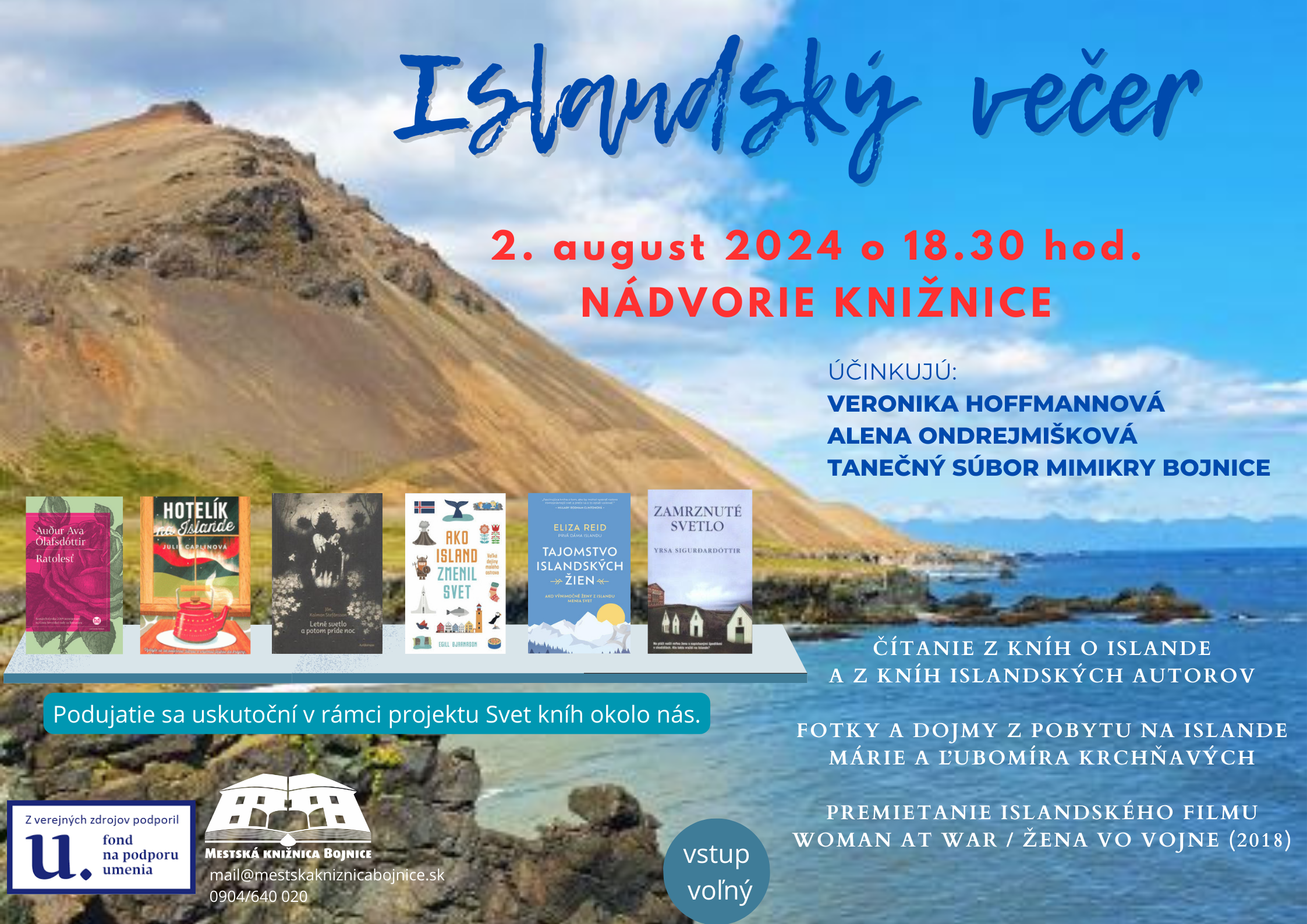 Večer o Islande a z kníh islandských autorov. Počas večera odprezentujú fotografie z Islandu a porozprávajú o svojich dojmoch z tejto krajiny manželia Krchňaví. Na záver sa premietne islandský film Žena vo vojne.