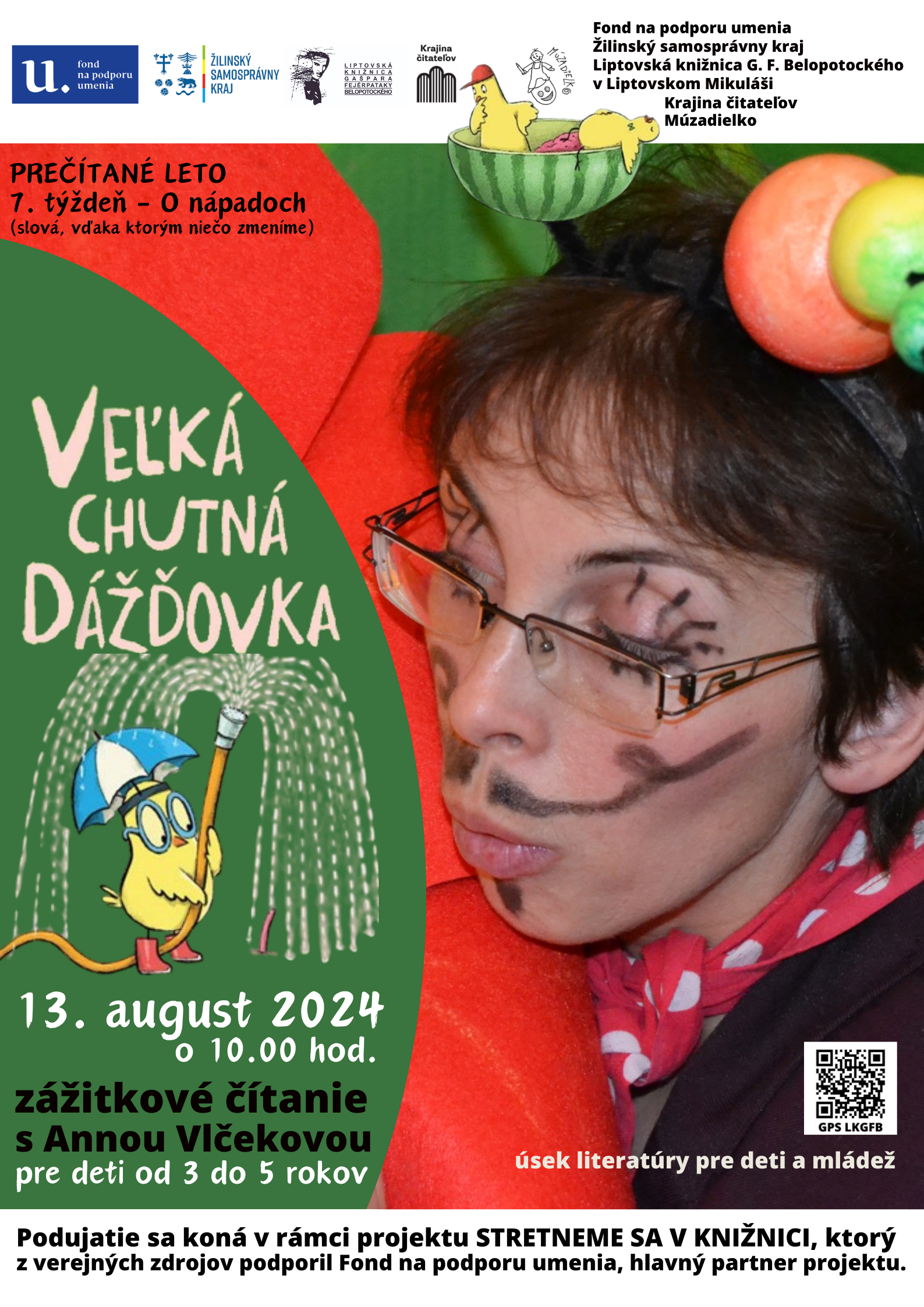 Veľká chutná dážďovka - zážitkové čítanie Anny Vlčekovej pre deti od 3 do 5 rokov; 13. august 2024 o 10.00 hod. v úseku literatúry pre deti a mládež