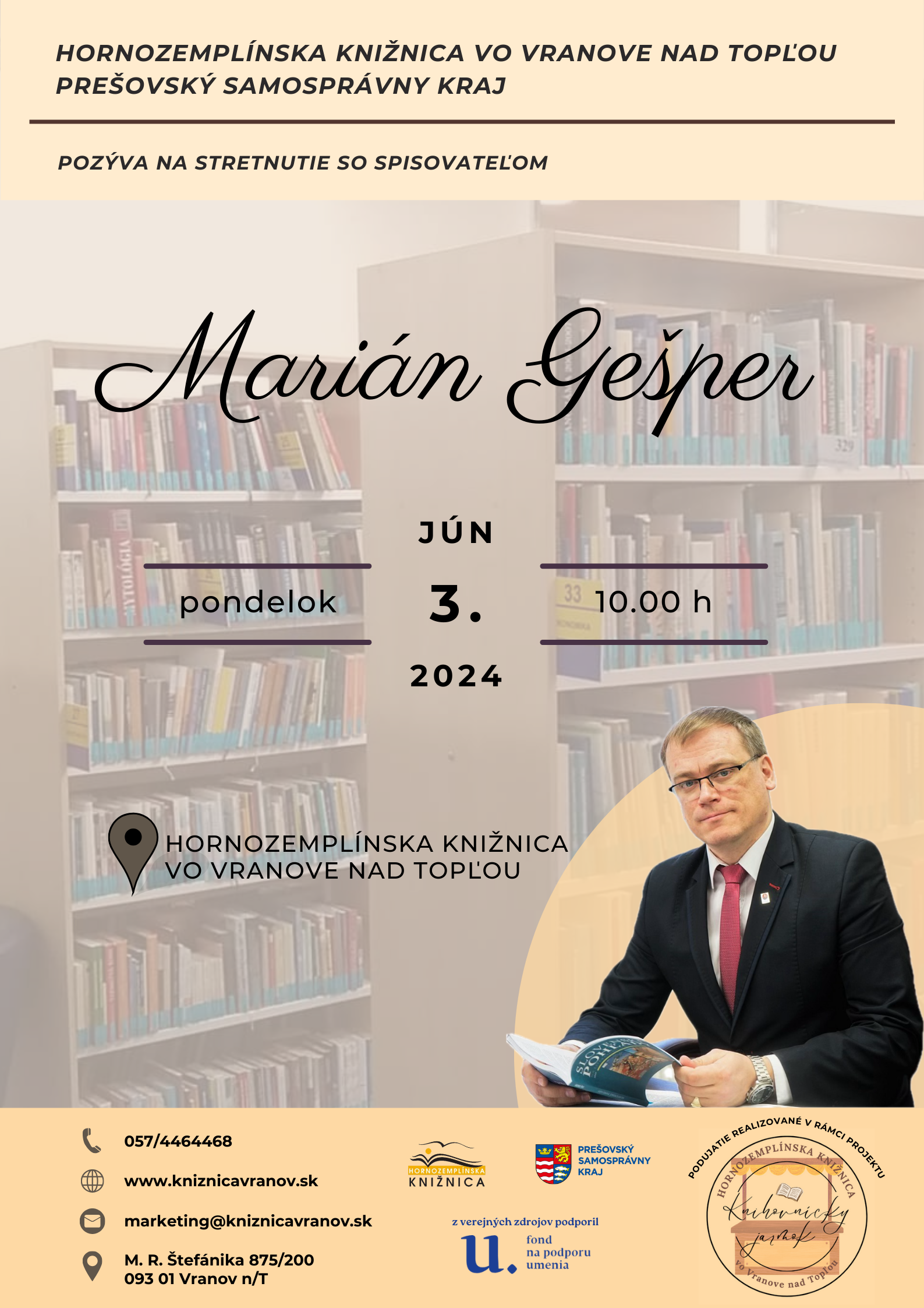 Hornozemplínska knižnica vo Vranove nad Topľou vás srdečne pozýva na stretnutie s predsedom Matice slovenskej Mariánom Gešperom, ktoré sa uskutoční dňa 03.06.2024 o 10.00 h. Témou prednášky bude Horný Zemplín, mesto Vranov nad Topľou a okolie.
