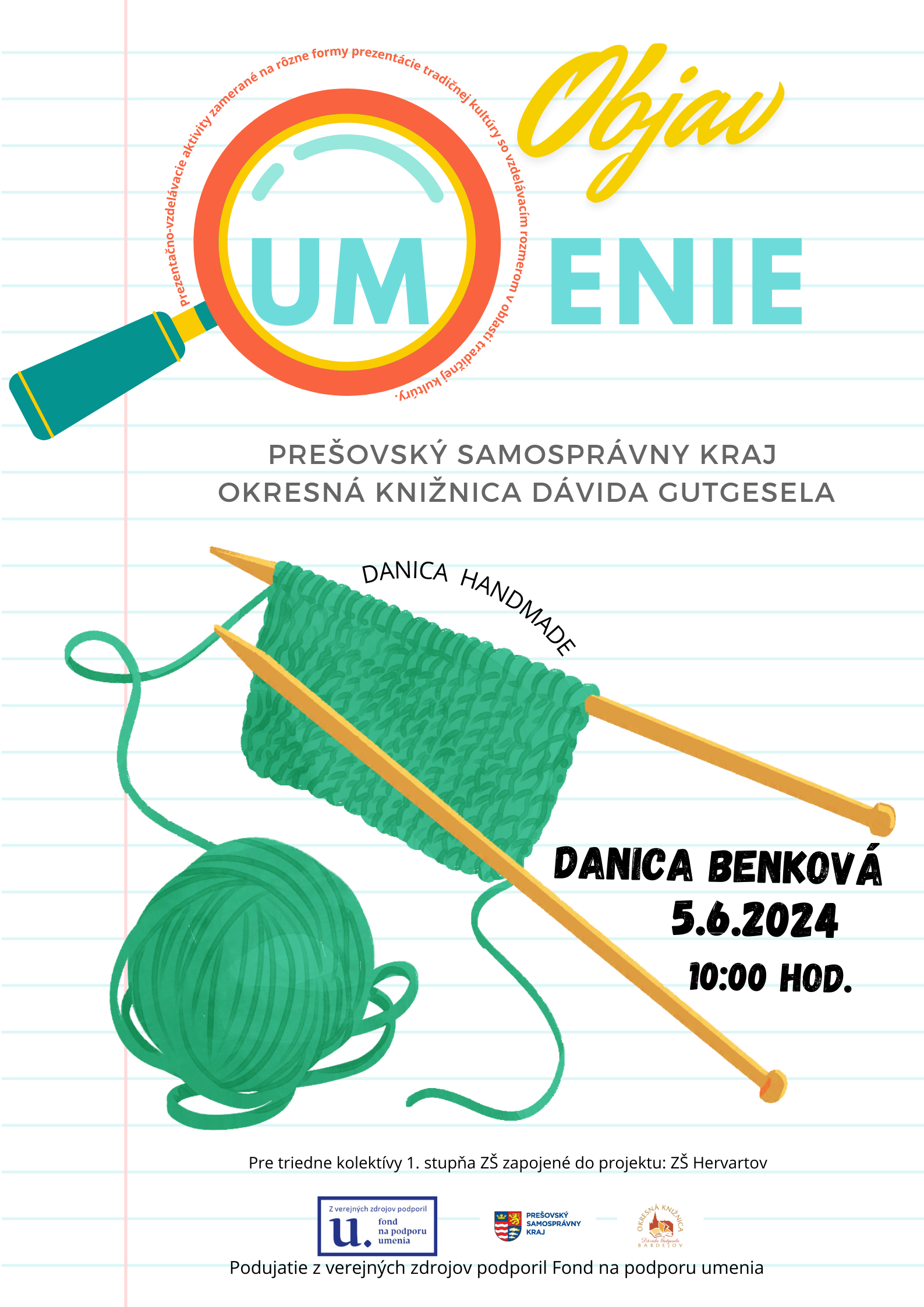 Prezentačno-vzdelávacia aktivita zameraná na prezentáciu tradičnej kultúry pre žiakov 1. stupňa ZŠ s regionálnou remeselníčkou Danicou Benkovou- Danica Handmade, ktorá žiakov oboznámi s háčkovaním, prostredníctvom výstavy si žiaci pozrú výrobky a vyskúšajú si techniku háčkovania a zhotovia svoje produkty.