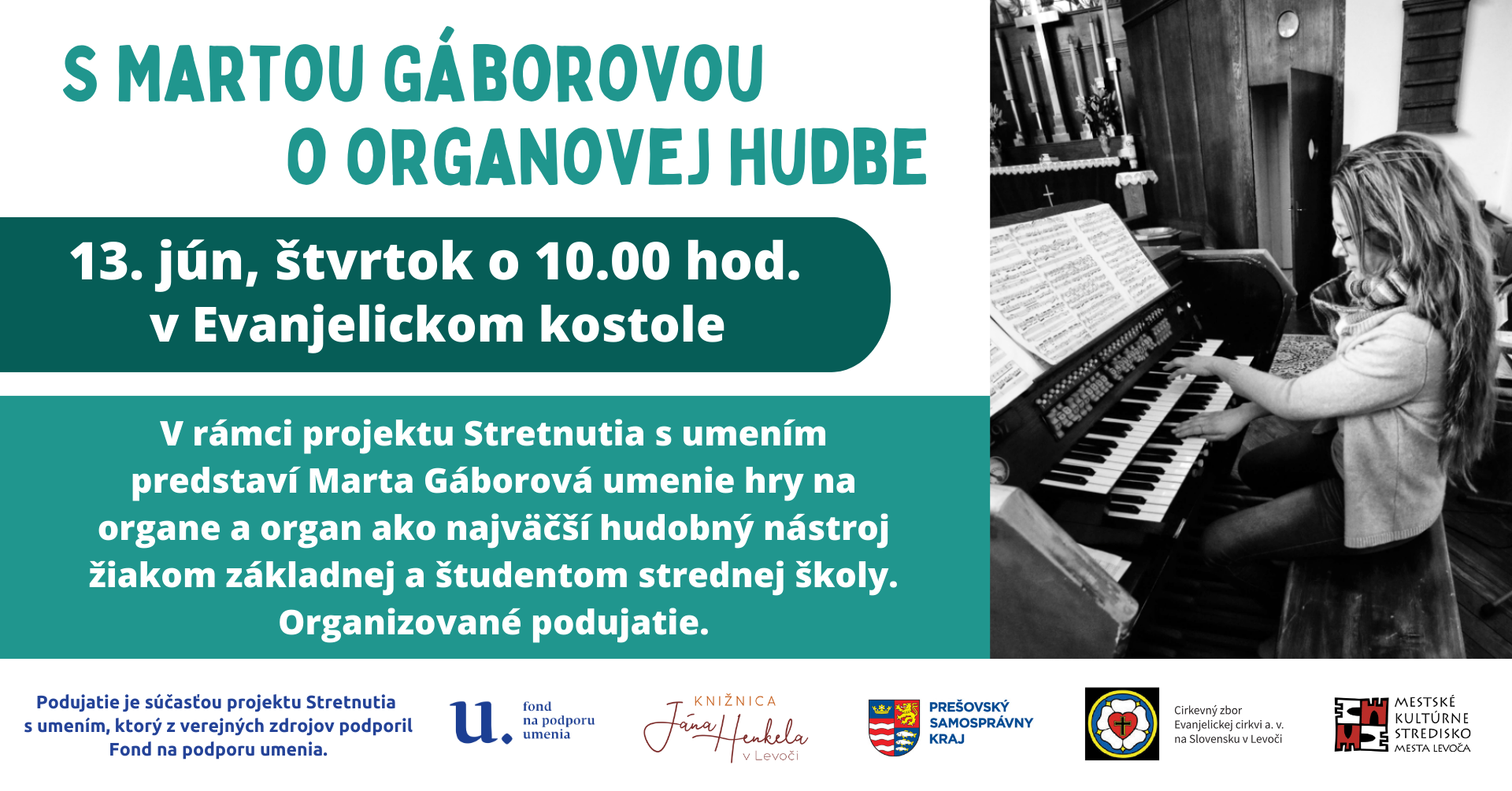 Hlavným cieľom projektu je sprostredkovať žiakom a študentom základných a stredných škôl v okrese Levoča kontakt s rôznymi druhmi umenia prostredníctvo podujatí s prezentačnou a vzdelávacou časťou. V júni nás navštívi Marta Gáborová, ktorá žiakom predstaví umenie hry na organ.