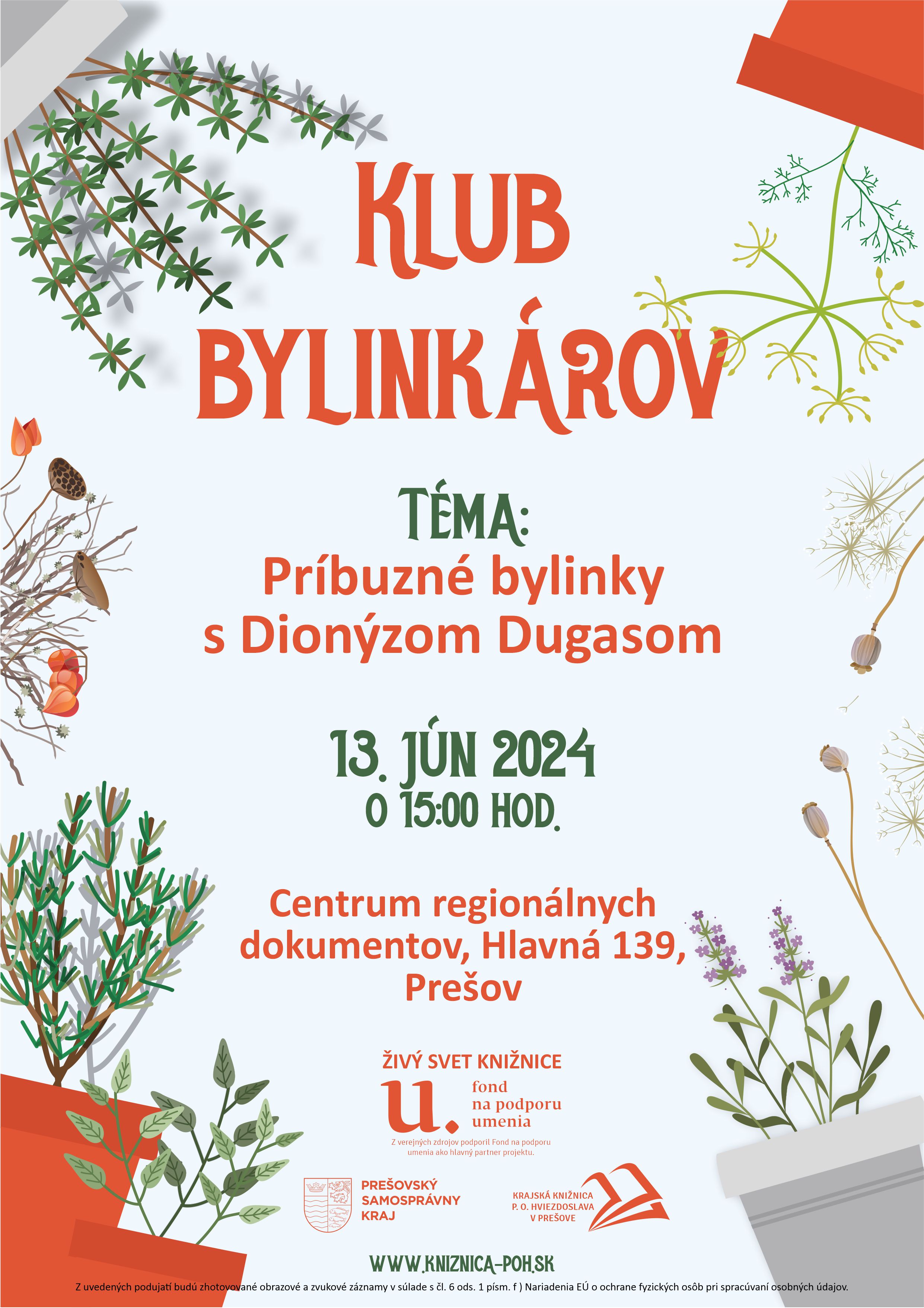 Milí čitatelia a čitateľky, prijmite naše pozvanie na stretnutie obľúbeného Klubu bylinkárov. V júni sa k bylinkárom opäť pridá zaujímavý hosť - Dionýz Dugas.