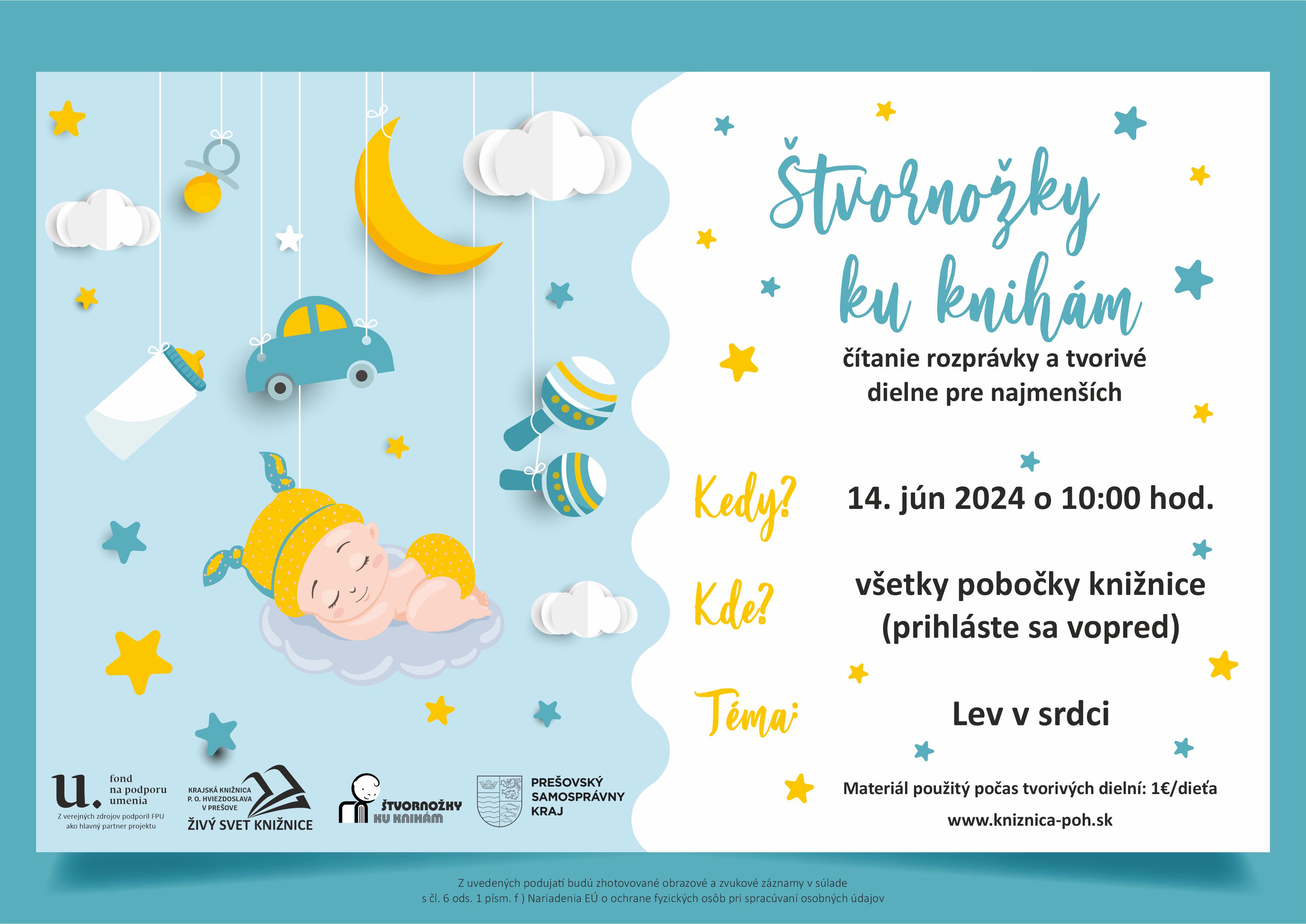 Milé detičky a rodičia, aj v júni sa stretneme na obľúbenom podujatí Štvornožky ku knihám. Tento mesiac sa uskutoční v piatok 14. júna 2024 o 10:00 hod. na sídliskových pobočkách Sekčov, Sídlisko 3, Šváby, Sídlisko 2 a v Detskej knižnici Slniečko. Budeme si čítať príbeh z knihy Lev v srdci. Podujatie je organizované v rámci projektu Živý svet knižnice.