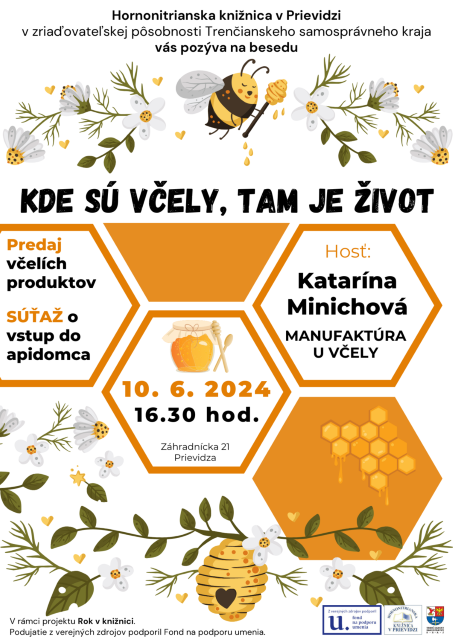 Malý živočích s obrovským významom - to je včela. Včela medonosná má veľmi dôležité postavenie v kolobehu života. Je najcennejším opeľovačom okrasných aj divo žijúcich rastlín. Beseda s Katarínou Minichovou bude nielen o apiterapii, ale aj o práci včelára a spracovaní včelieho vosku do nádherných dekoratívnych predmetov a sviečok .