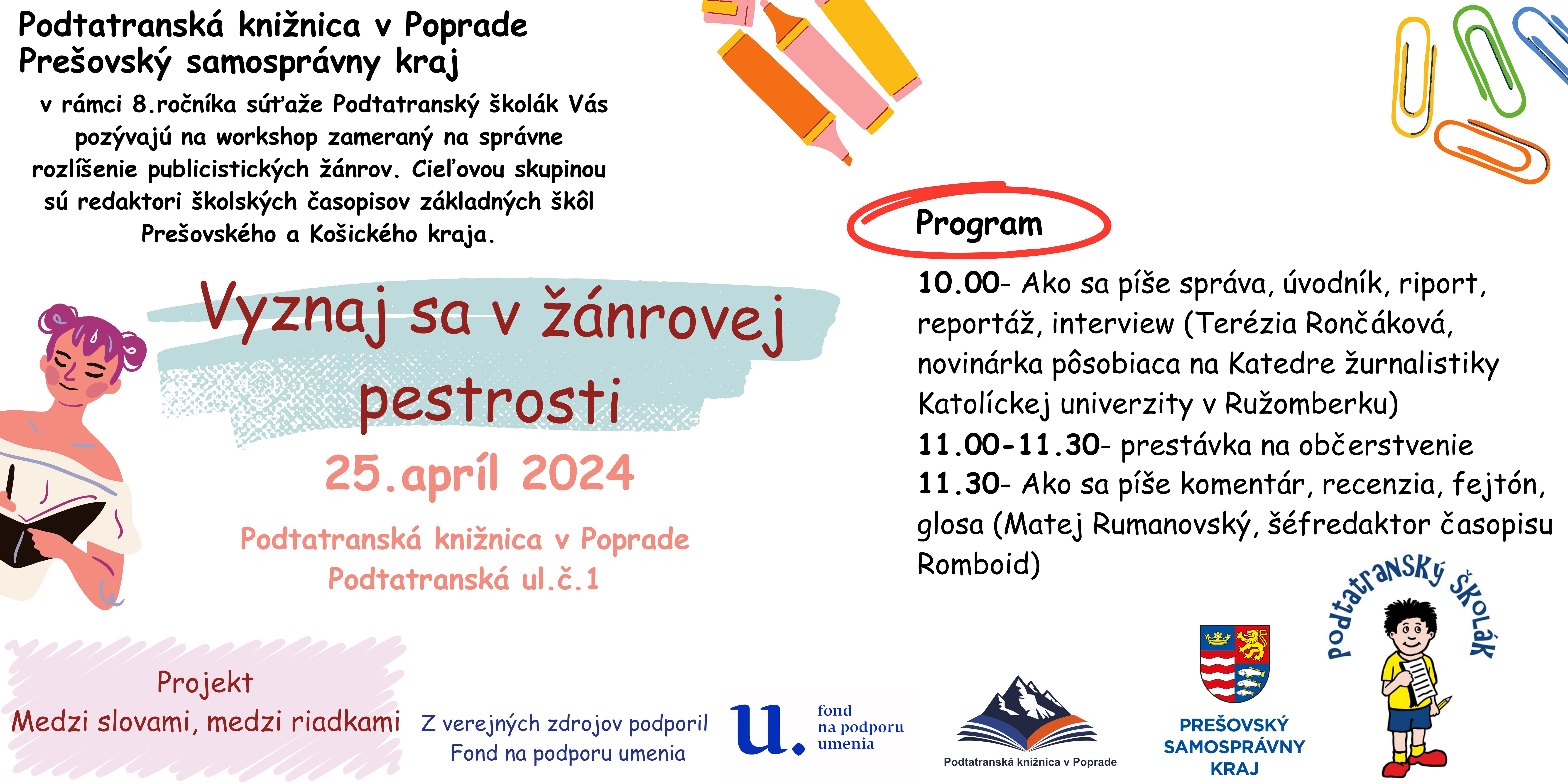 V rámci 8.ročníka súťaže školských časopisov základných škôl Prešovského a Košického samosprávneho kraja Podtatranský školák, organizujeme workshop, zameraný na správne rozlíšenie publicistických žánrov. Lektormi budú Terézia Rončáková z Katedry žurnalistiky Katolíckej univerzity v Ružomberku a Matej Rumanovský, šéfredaktor časopisu Romboid. Súťaž je súčasťou projektu Medzi slovami, medzi riadkami.