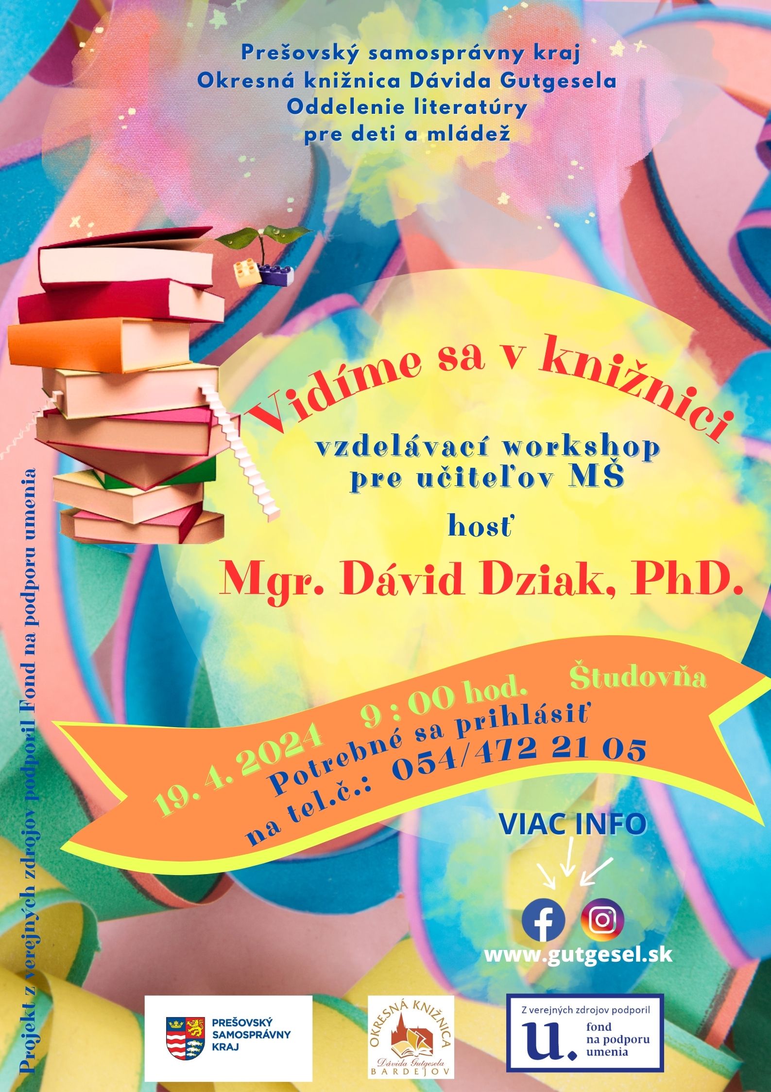 Vzdelávací workshop o detskej literatúre pre učiteľov MŠ s hosťom Mgr. Dávidom Dziakom, PhD., ktorý pôsobí ako odborný asistent na Katedre komunikačnej a literárnej výchovy na Pedagogickej fakulte PU v Prešove a špecializuje sa na literatúru pre deti a mládež. Témou workshopu je predčitateľská gramotnosť v materskej škole.