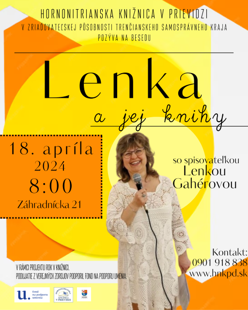 Spisovateľka Lenka Gahérová už 18.4.2024 predstaví žiakom základných škôl svoju literárnu tvorbu. Lenka Gahérová je prievidzská spisovateľka, ktorá sa venuje tvorbe detskej literatúry a románov pre ženy. Jej meno môžu čitatelia poznať najmä z titulov obľúbených detských kníh, akými sú TriDé z 3.D alebo Máša a Lily. Počas svojej návštevy našej knižnice na Záhradnickej 21 nám priblíži príbehy svojich kníh venovaných detským čitateľom.