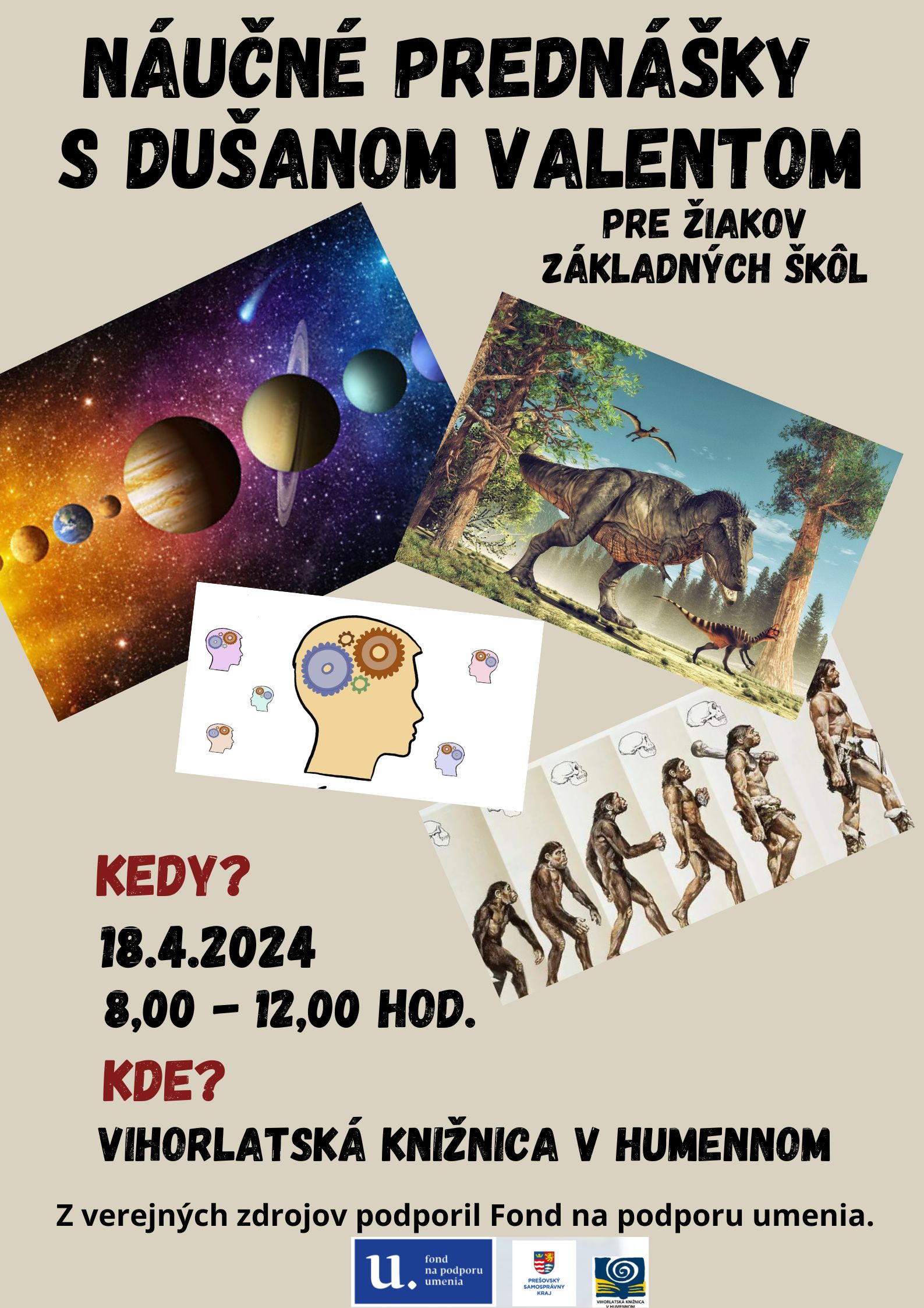 Interaktívna prednáška paleontológa, vedeckého publicistu, spisovateľa Dušana Valentu predstaví zvláštnosti a prekvapivé skutočnosti, ktoré môžu zmeniť pohľad na pradávnu minulosť.