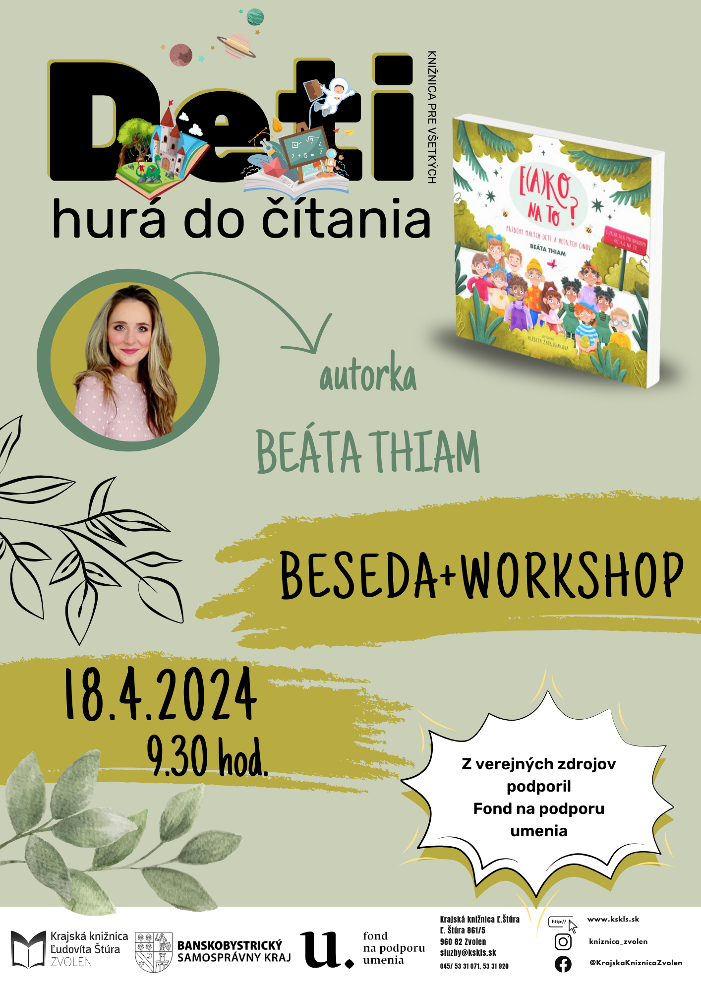 Beseda a workshop so spisovateľkou Beátou Thiam. Podujatie z cyklu Deti hurá do čítania je súčasťou projektu Knižnica pre všetkých, ktorý z verejných zdrojov podporil Fond na podporu umenia.