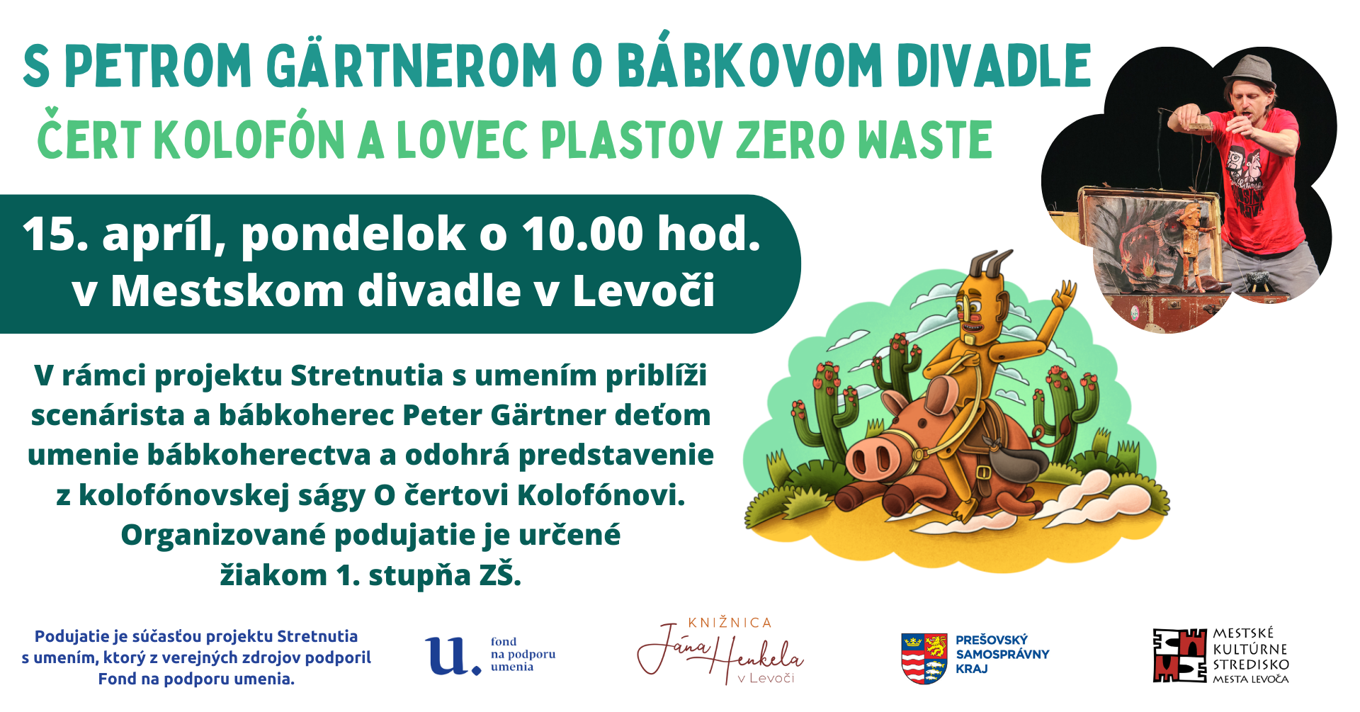 Hlavným cieľom projektu je sprostredkovať žiakom a študentom základných a stredných škôl v okrese Levoča kontakt s rôznymi druhmi umenia prostredníctvo podujatí s prezentačnou a vzdelávacou časťou. V apríli sme pripravili stretnutie s bábkohercom Petrom Gärtnerom pre žiakov ZŠ.