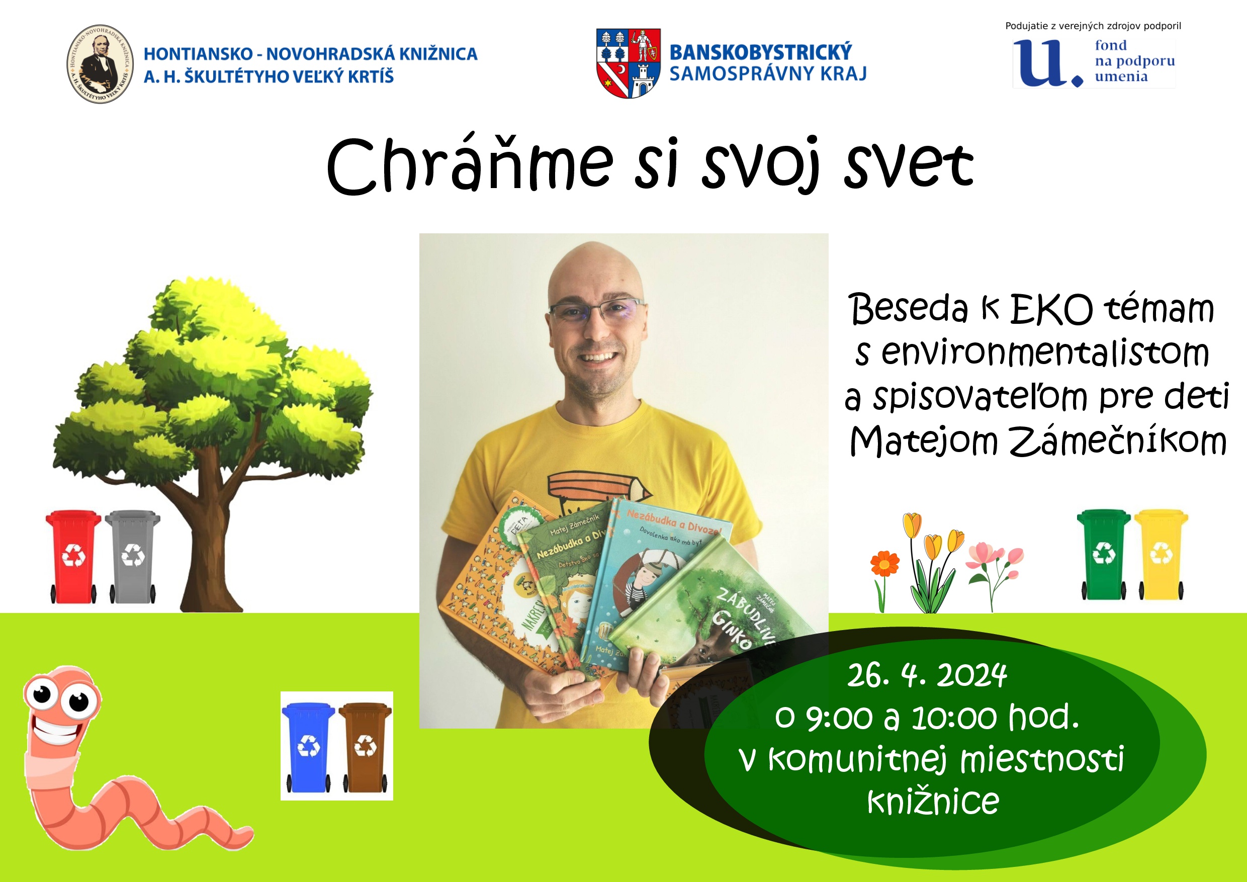 Už 19. apríla o 8.15 hod. a 9.15 hod. našu knižnicu na besede navštívi spisovateľ Matej Zámečník. Deťom predstaví svoju tvorbu, ktorá spája tematiku kreativity a ochrany životného prostredia, triedenia odpadu či kompostovania. Kniha Zábudlivé Ginko navyše ukrýva osvetu o ochorení skleróza multiplex a faktografické informácie z biológie.