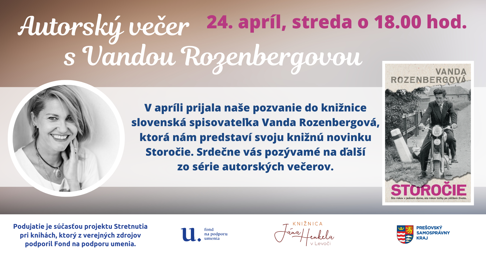 V rámci projektu Stretnutia pri knihách sme pre vás pripravili stretnutia so slovenskými autormi. V apríli nás navštívi autorka Vanda Rozenbergová, ktorá nám predstaví svoju najnovšiu knihu Storočie.