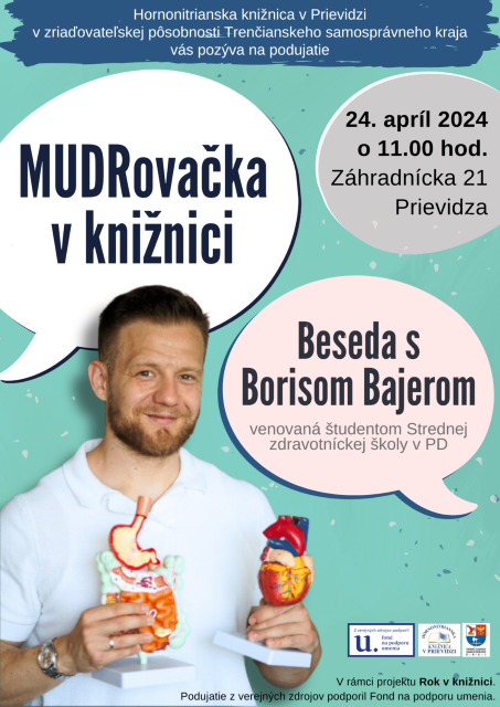 Do našej knižnice prijal pozvanie lekár, výživový špecialista a autor populárnych kníh - Boris Bajer. Študentom strednej zdravotníckej školy priblíži zaujímavosti z jeho praxe, s ktorými sa denne stretáva a zasvätí ich do zákutí medicíny tak, ako ju ešte nepoznajú. Prostredníctvom besedy študentom sprostredkujeme stretnutie a možnosť diskutovať s odborníkom, ktorý by im v profesijnom živote mohol byť vzorom.