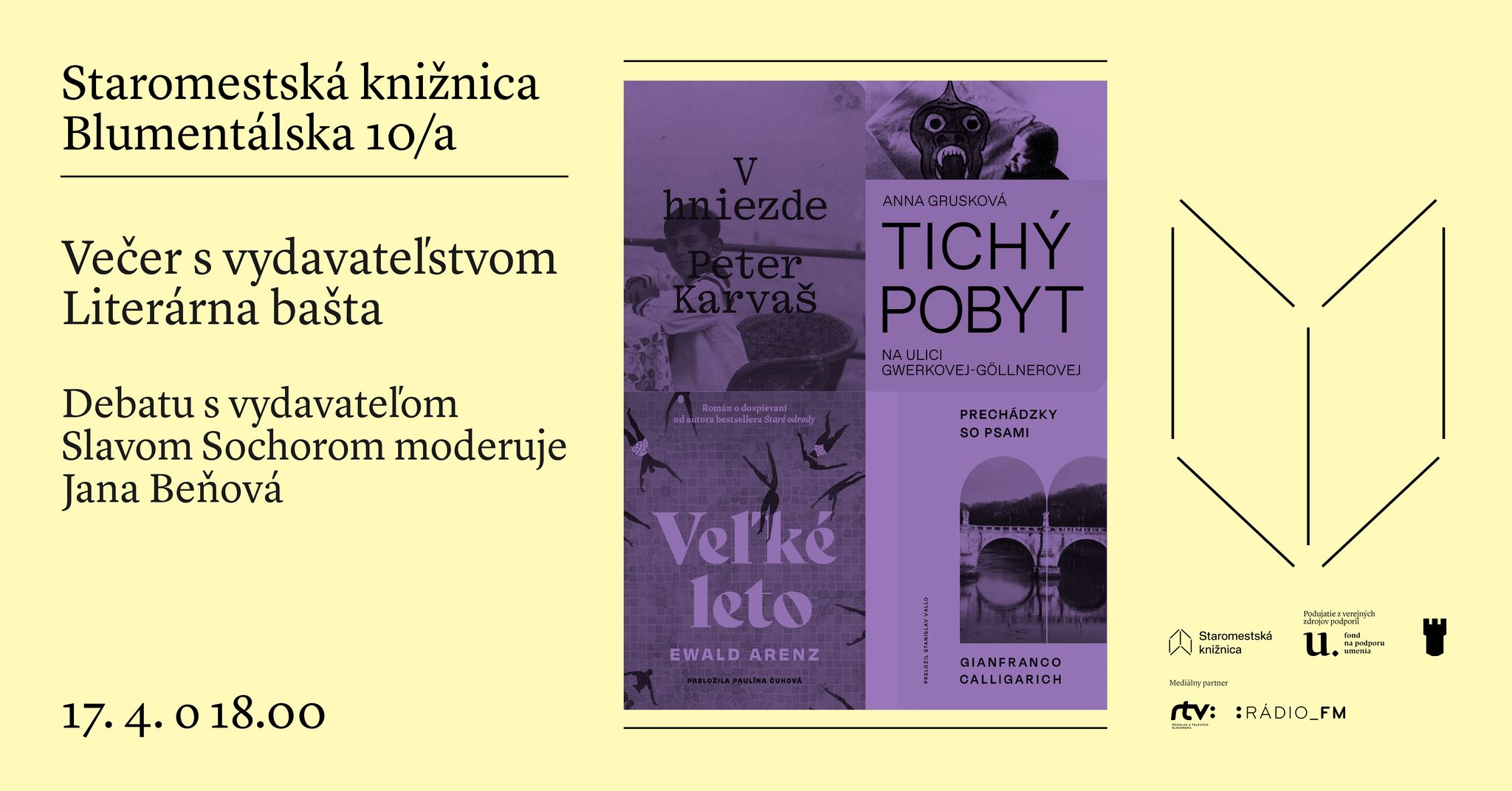 Hosťom Jany Beňovej bude vydavateľ Slavo Sochor. Počas večera sa zameriame na štyri tituly – dva slovenské – V hniezde Petra Karvaša a Tichý pobyt na ulici Gwerkovej-Göllnerovej od Anny Gruskovej a dve prekladové diela – minuloročný letný bestseller Veľké leto (Ewald Arenz) a Prechádzky so psami (Gainfranco Calligarich).