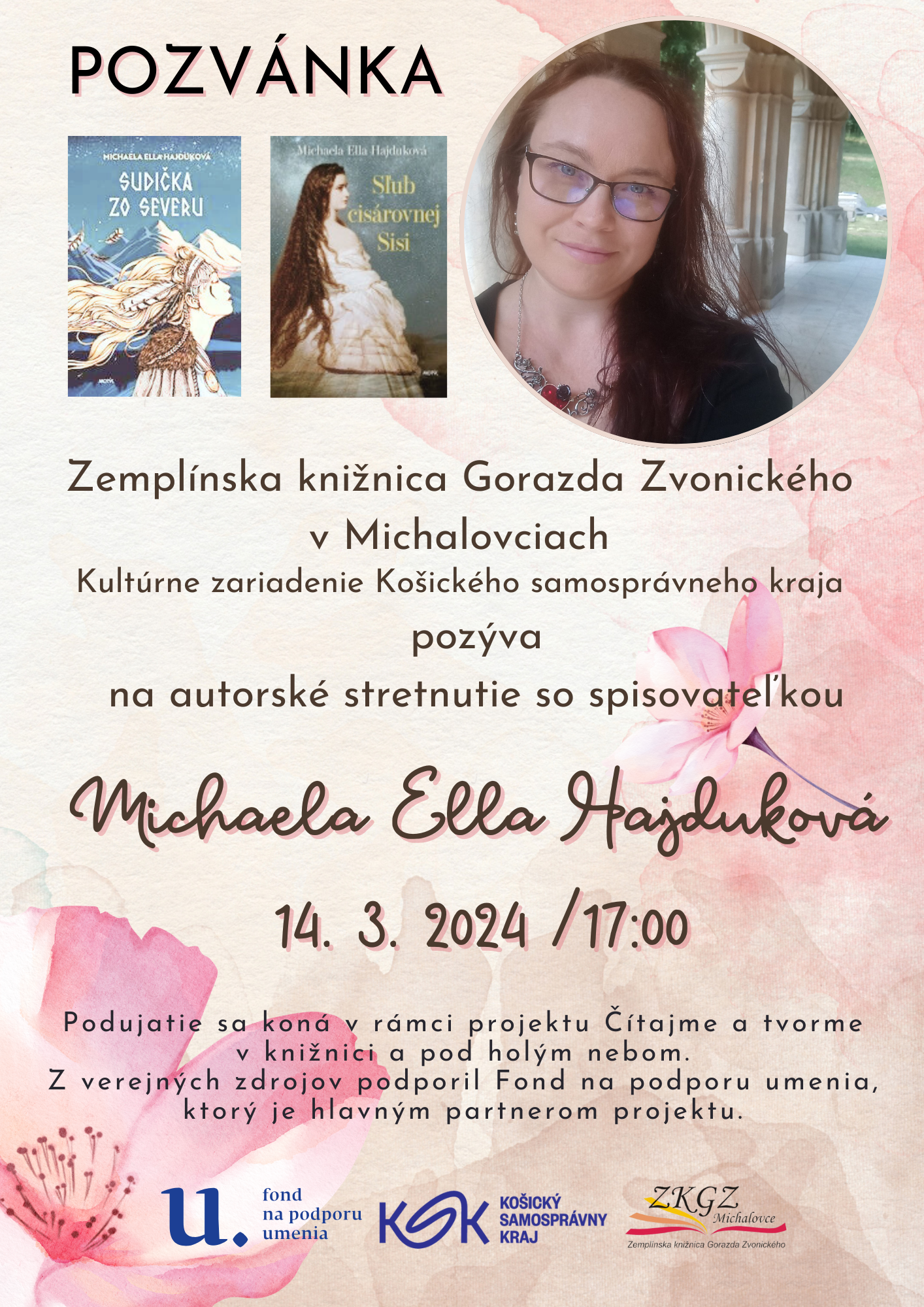 Stretnutie so spisovateľkou Michaelou Ellou Hajdukovou. Beseda bude venovaná jej dvom najnovším knihám: Sľub cisárovnej Sisi a Sudička zo Severu.