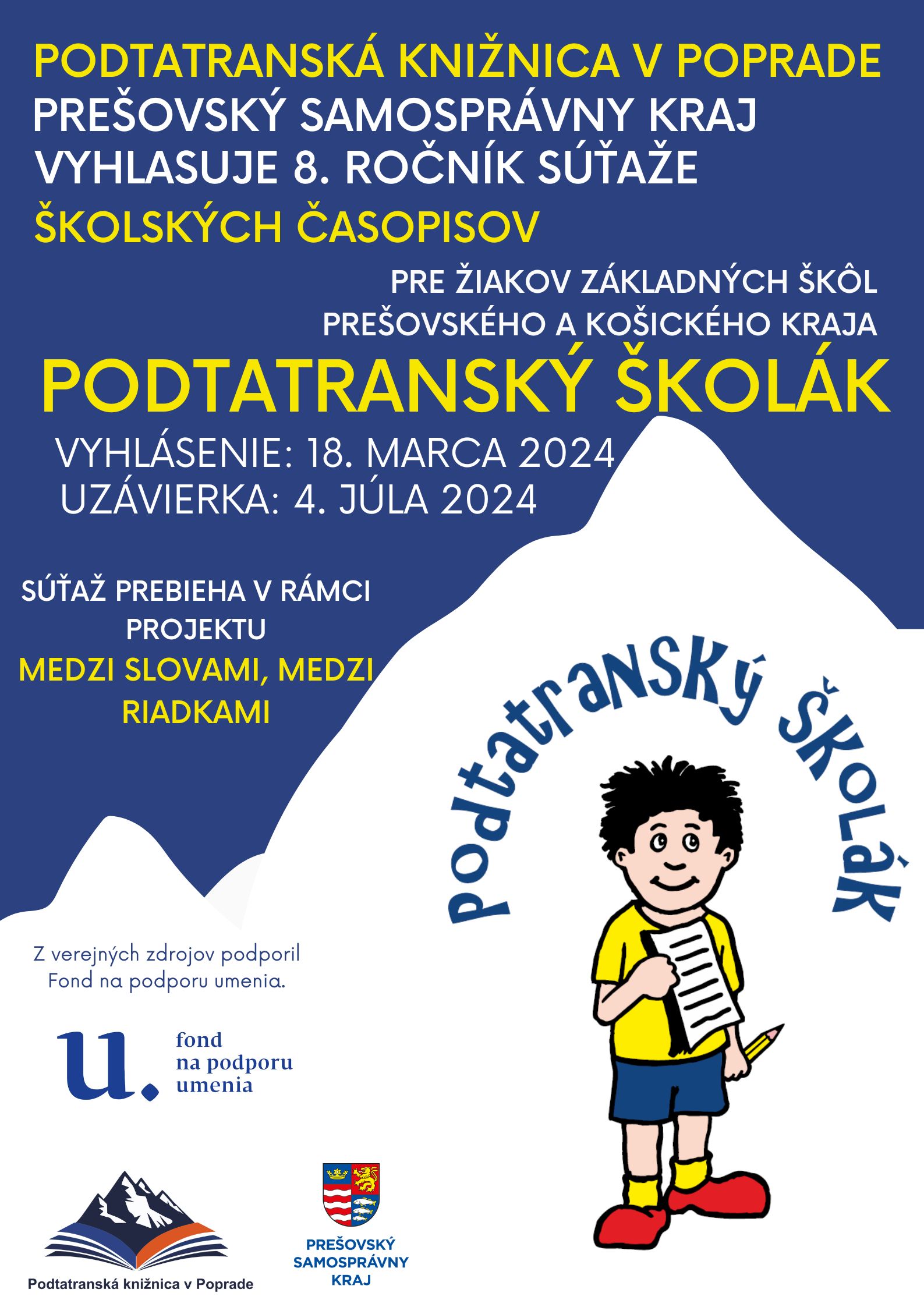 Podtatranská knižnica v Poprade vyhlasuje v rámci projektu Medzi slovami, medzi riadkami, súťaž školských časopisov základných škôl Prešovského a Košického kraja. Cieľom súťaže je podporiť a podchytiť začínajúce školské časopisy a zvýšiť odbornú úroveň už vydávaných časopisov. Tešíme sa na všetky školské časopisy, ktoré prihlásite do súťaže. Projekt z verejných zdrojov podporil Fond na podporu umenia. Prihlášku do súťaže nájdete na webovej stránke Podtatranskej knižnice v Poprade