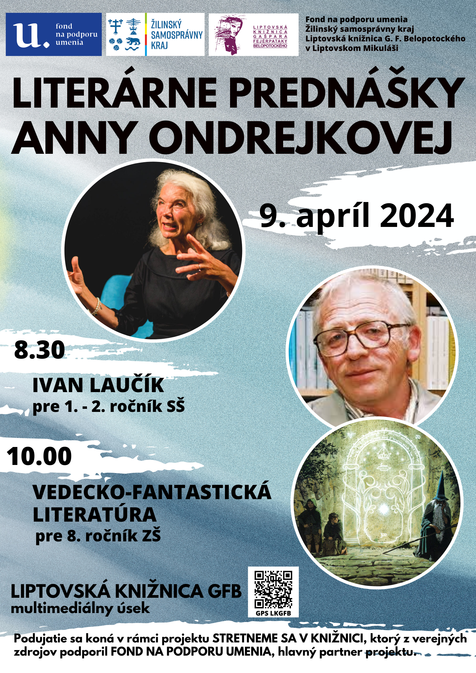 Literárne prednášky Anny Ondrejkovej – 9. apríl 2024 - od 8.30 hod. prednáška - Ivan Laučík pre SŠ; od 10.00 hod. prednáška Vedecko-fantastická literatúra pre II. stupeň ZŠ