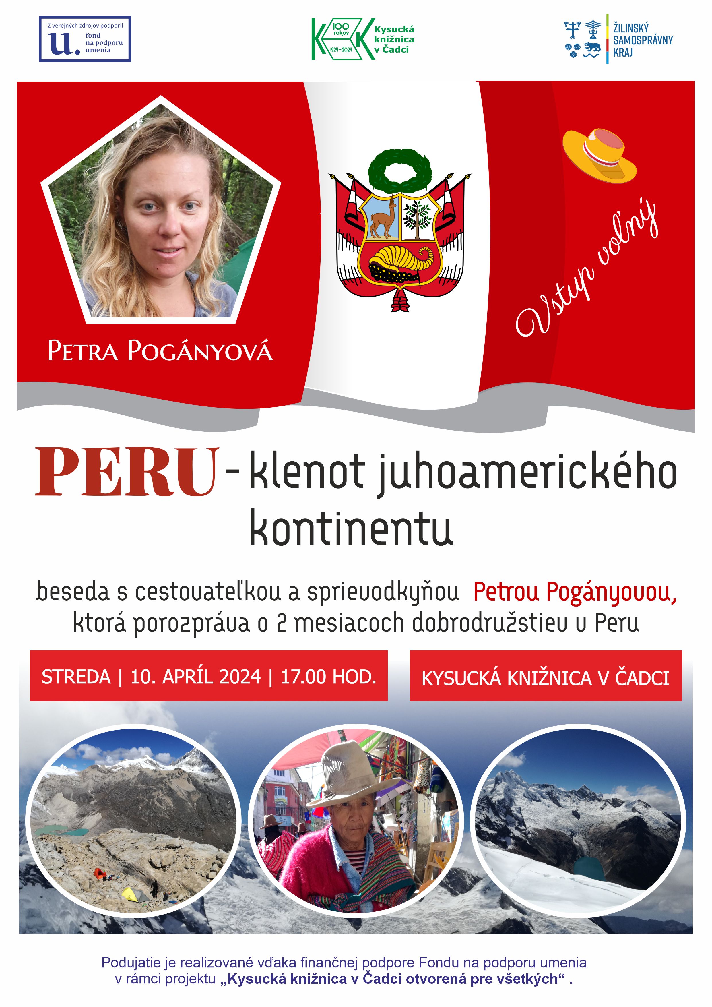 Beseda s cestovateľkou a sprievodkyňou Petrou Pogányovou, ktorá porozpráva o 2 mesiacoch dobrodružstiev v Peru.