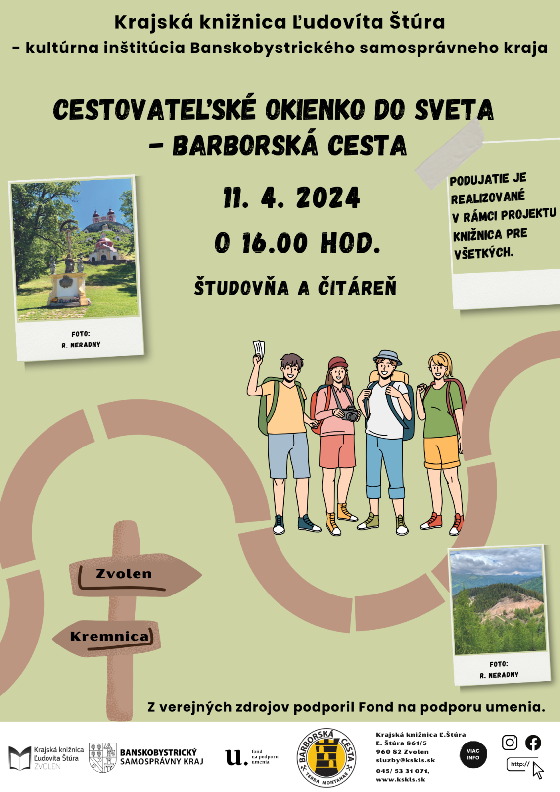 Spoznajte slávnu históriu zvolenského regiónu spojenú s baníctvom už niekoľko storočí. Vydajte sa s nami na Barborskú cestu v rámci prezentácie, ktorá sa uskutoční dňa 11. apríla 2024 v študovni Krajskej knižnice Ľudovíta Štúra o 16.00 hod. Podujatie sa uskutoční v spolupráci s OZ Banský Región -Terra Montanae.