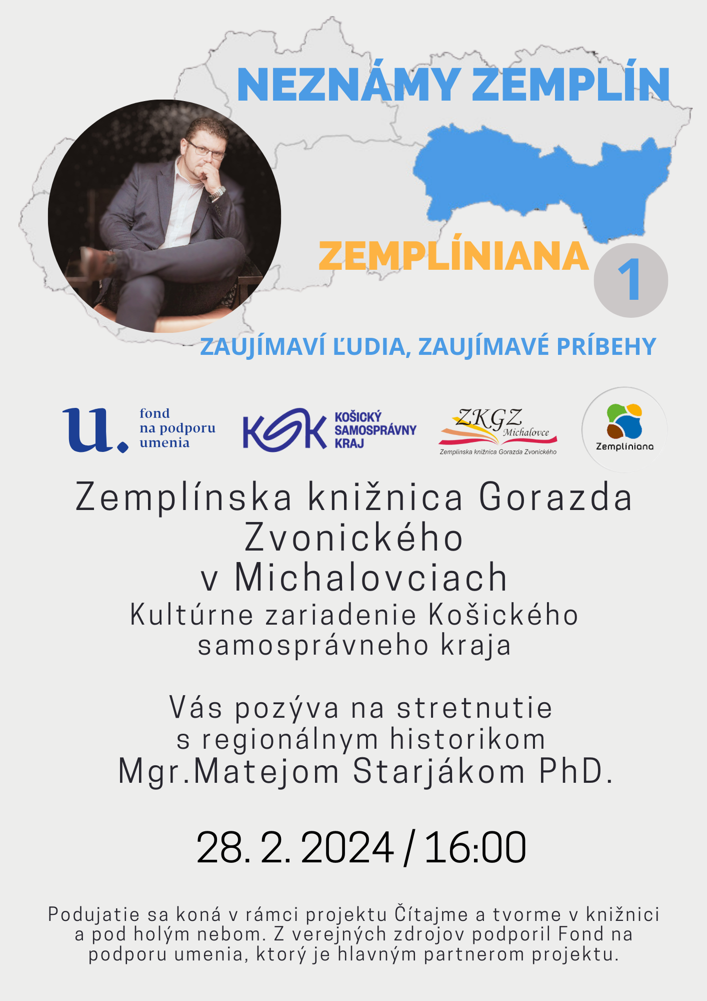 Stretnutie s regionálnym historikom Mgr. Matejom Starjákom PhD. Obsahom prednášky budú zaujímaví ľudia, zaujímavé príbehy z regiónu.