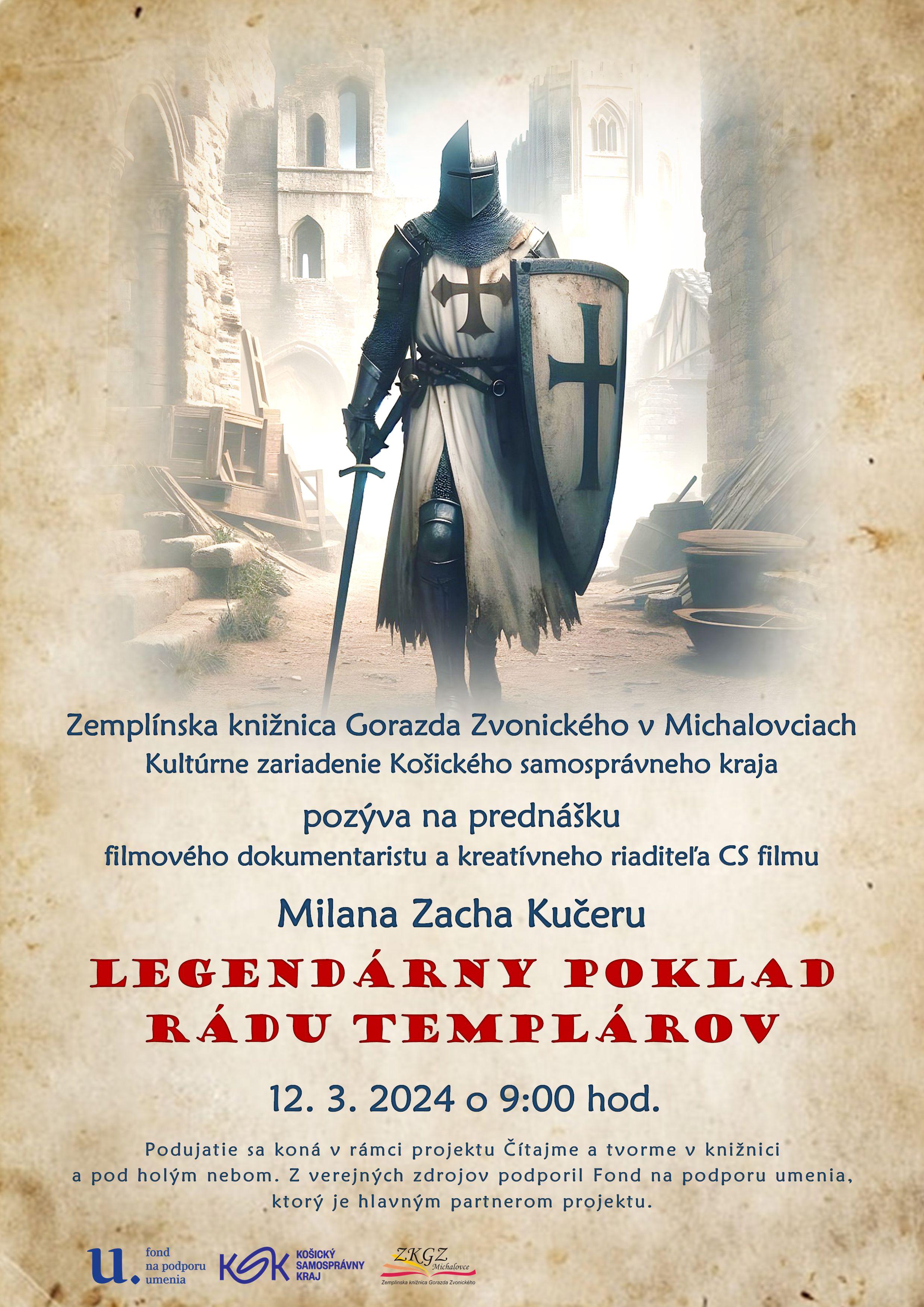 Prednášajuci Milan Zacha Kučera nám priblíži legendárny Rád templárov, jeden z najmocnejších kresťanských rádov stredoveku, symbolom je červený kríž a biely plášť pre rytiera. Čo o nich vieme? Stále sú zahalení rúškom tajomstva. Ich úlohou bola ochrana pútnikov cestujúcich do Jeruzalema. Bohatstvo rádu bolo príčinou ich zániku. Odvtedy sa datuje honba za ich poklady, ktoré sú určite niekde schované.