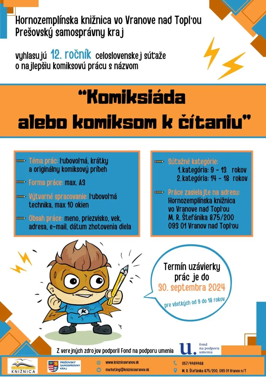 Komiksiáda alebo komiksom k čítaniu 2024 Hornozemplínska knižnica vo Vranove nad Topľou a Prešovský samosprávny kraj v rámci projektu VRANOVSKÉ KNIHODNI vyhlasujú tradičnú celoslovenskú súťaž o najlepšiu komiksovú prácu s názvom „KOMIKSIÁDA ALEBO KOMIKSOM K ČÍTANIU“.